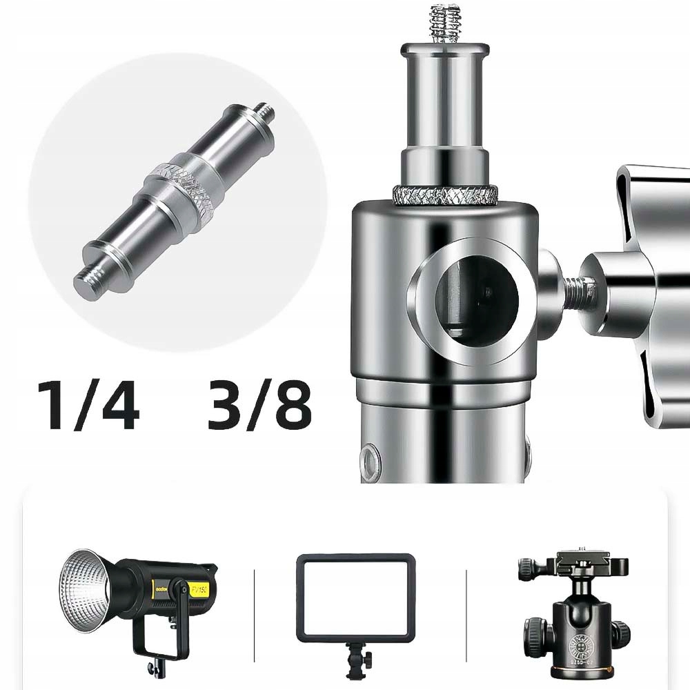 ✔️ УНИВЕРСАЛЬНОЕ ПРИМЕНЕНИЕ Светильник оснащен 16-миллиметровым штифтом с резьбой 1/4 дюйма и 3/8, совместимым с большинством студийных ламп и других фотографических аксессуаров. б> р>
