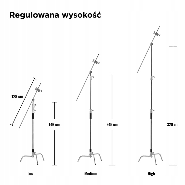 Штатив позволяет легко регулировать высоту от 154 до 340 см. Имеет прочные соединения и удобные в использовании зажимы. Он оснащен горизонтальной рамой длиной 132 см и регулируемым углом наклона, что позволяет удобно настраивать верхнее освещение. Он также имеет выдвижные ножки (каждую можно регулировать на 120 градусов) с резиновыми ножками.