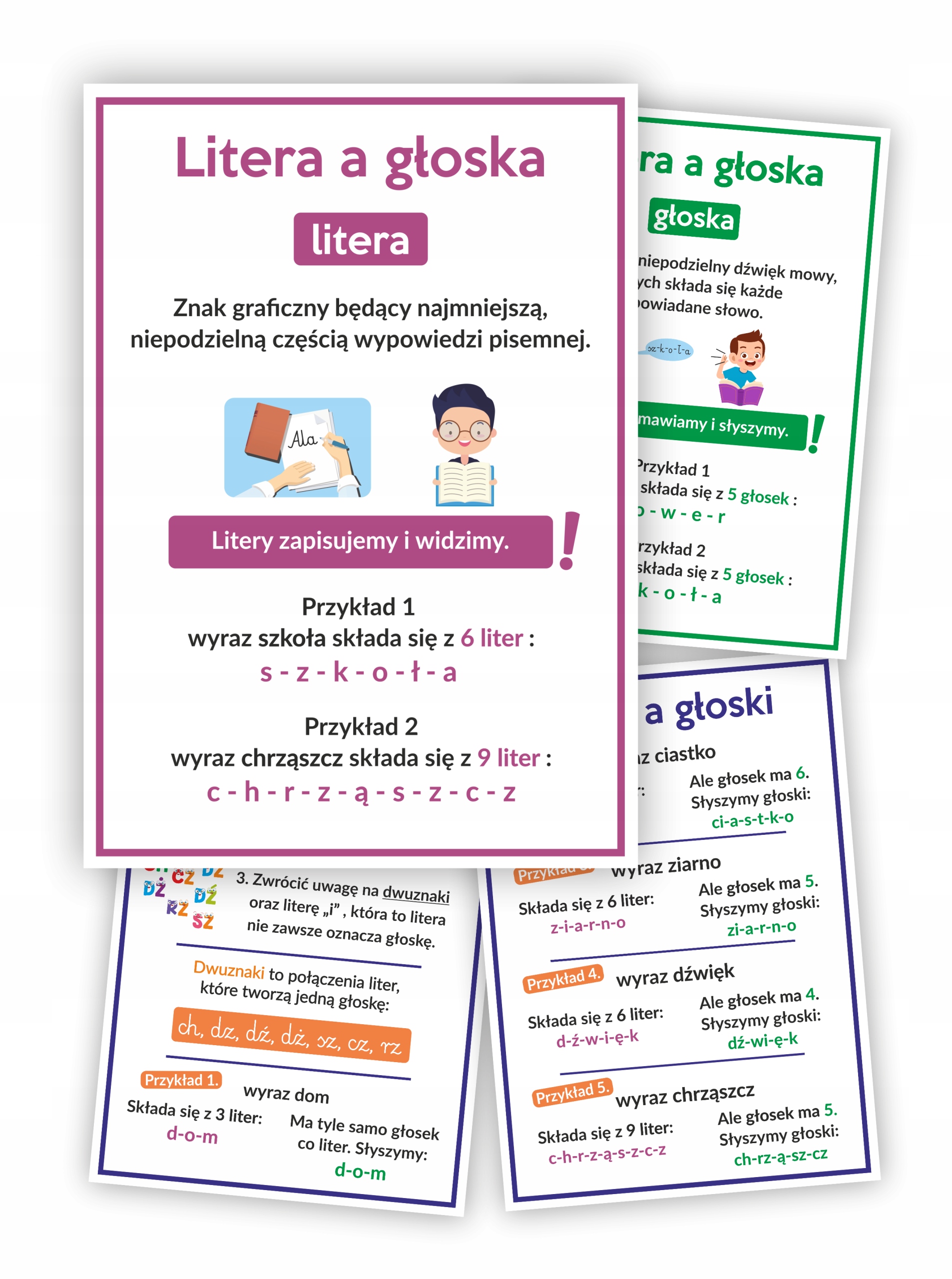 В комплект входят 4 односторонние фольгированные доски формата А4 с пояснениями различий между буквами и звуками и информацией о том, как правильно делить слова на звуки.