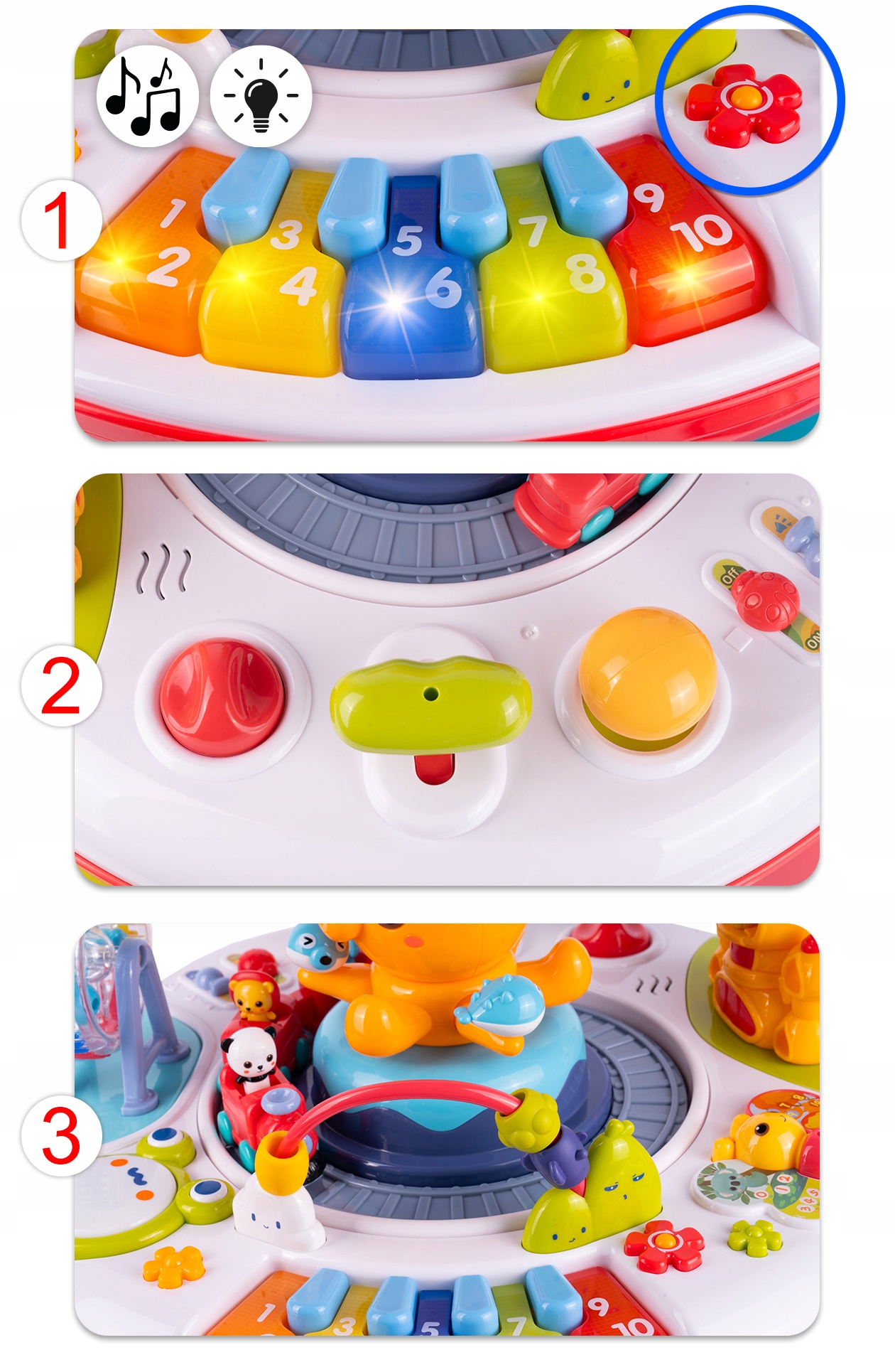 Малыш может исследовать таблицу, нажав красочные кнопки, которые активирует различные звуки и эффекты. Это помогает в разработке ручных навыков и физической координации.