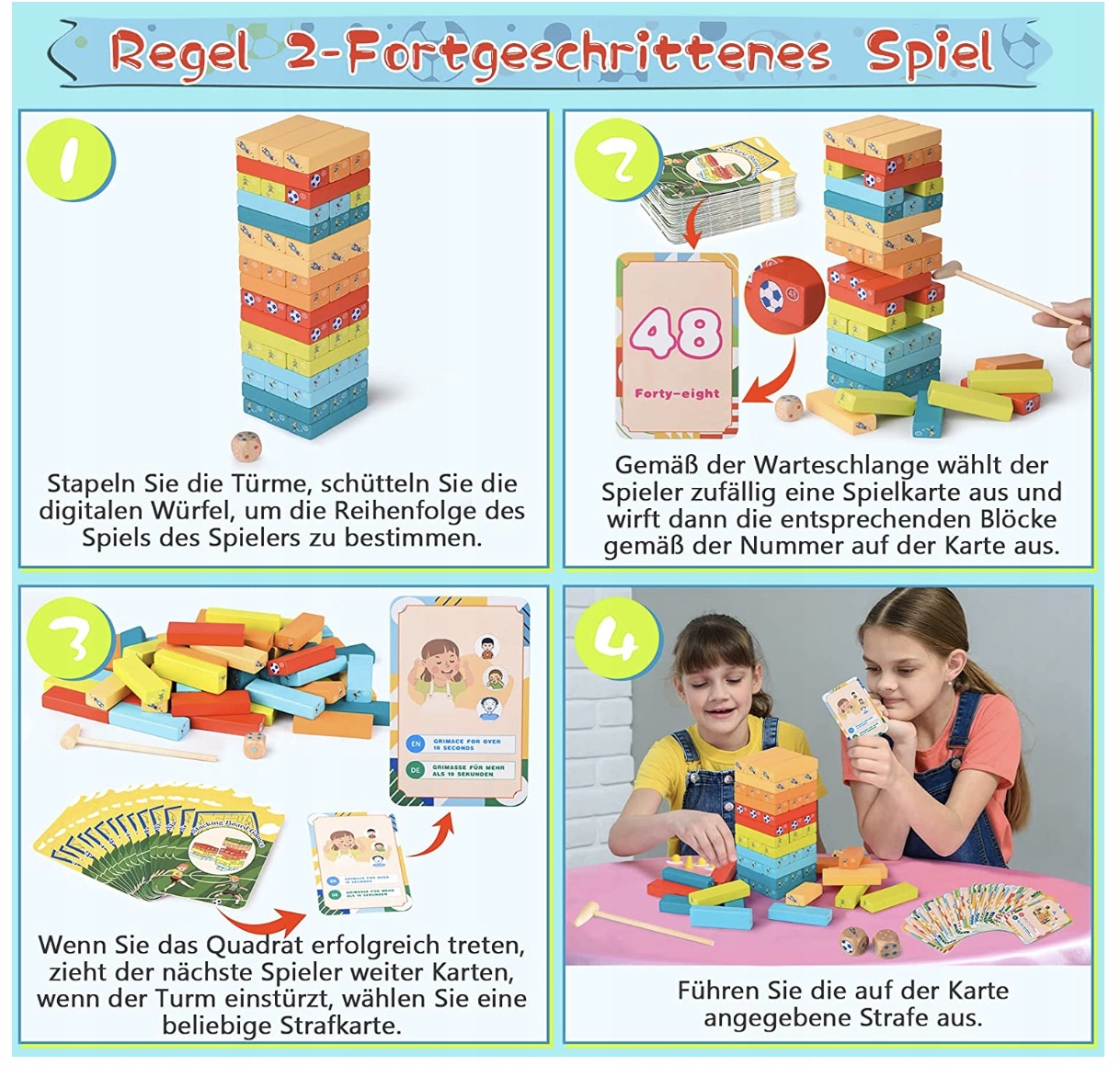 - ⚽【 Что вы получите】 Деревянная игрушка состоит из 121 элемента: 51 красочный блоки футбольного мультфильма, 66 мультфильмов (пронумерованные карты и уголовные карты), 1 мини, 2 куба и 1 карманы для хранения .