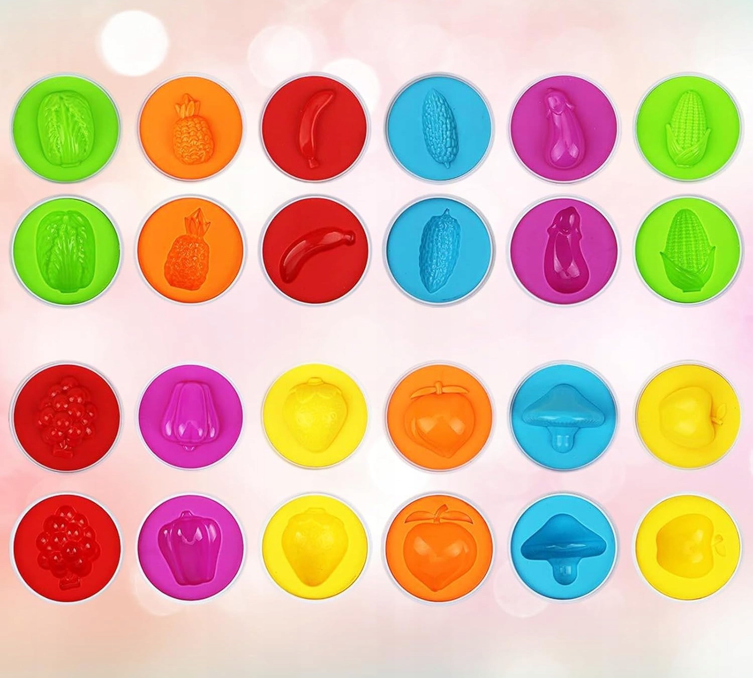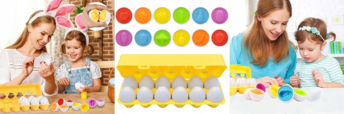 ⭐ набор содержит 12 белых открытых яиц в желтом экструдере . Яйца внутри имеют различные фрукты, овощи и цвета, что поощряет ребенка действовать и вызывает его интерес.