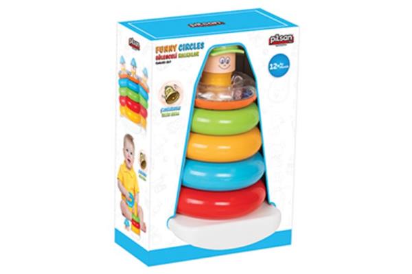 Образовательная пирамида (сортировщик из пластика). К стенду был прикреплен сообщение, на которой ребенок применяет диски, характеризующиеся различным цветом и диаметром. Последний альбом принимает форму характерного пончика (пончик). Внутри были размещены красочные шарики, которые мы можем увидеть. Они издают характерный, раскидающийся звук. У игрушки также есть колокол внутри. Пирамида закончена с улыбающимся лицом с яркой шляпой. Это автоматически привлекает внимание детей.