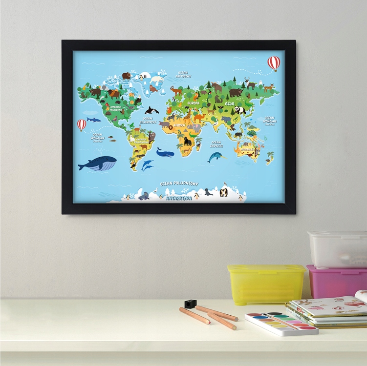 Образовательный плакат с рамой - Карта мировых животных - A3