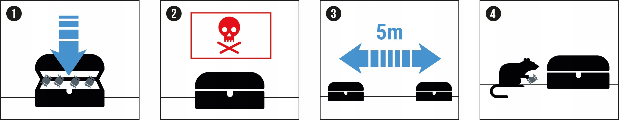 Станции с родентицидами следует размещать в недоступном для детей и домашних животных месте. Также следует помнить, что станции должны защищать приманку от неблагоприятных погодных условий. Минимальное расстояние между станциями должно составлять 5 м.
