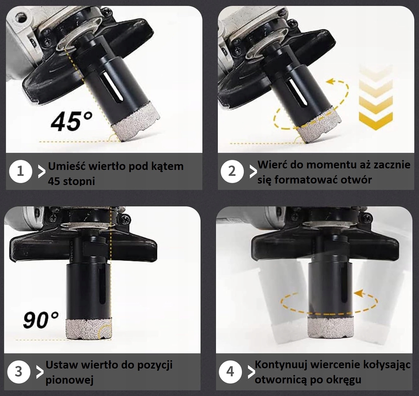 - Начинайте сверлить отверстия, располагая коронку под углом около 45 градусов к обрабатываемому материалу и затем круговыми движениями, что показано на показательном фото в галерее.