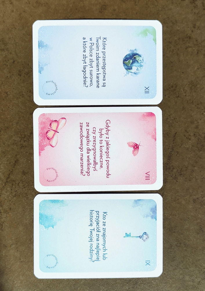 Человек, тянущийся за карточкой, отвечает на вопрос, указанный на ней. Конечно, самое ценное – это честность, но и размышление над ответом тоже ценно – это способ познать себя. Помните, однако, что ваши границы важны – если вы не хотите отвечать на вопрос, потому что, например, в той или иной группе вы предпочитаете не так сильно открываться, вы можете отказаться без объяснения причин. Другие обязаны уважать это.