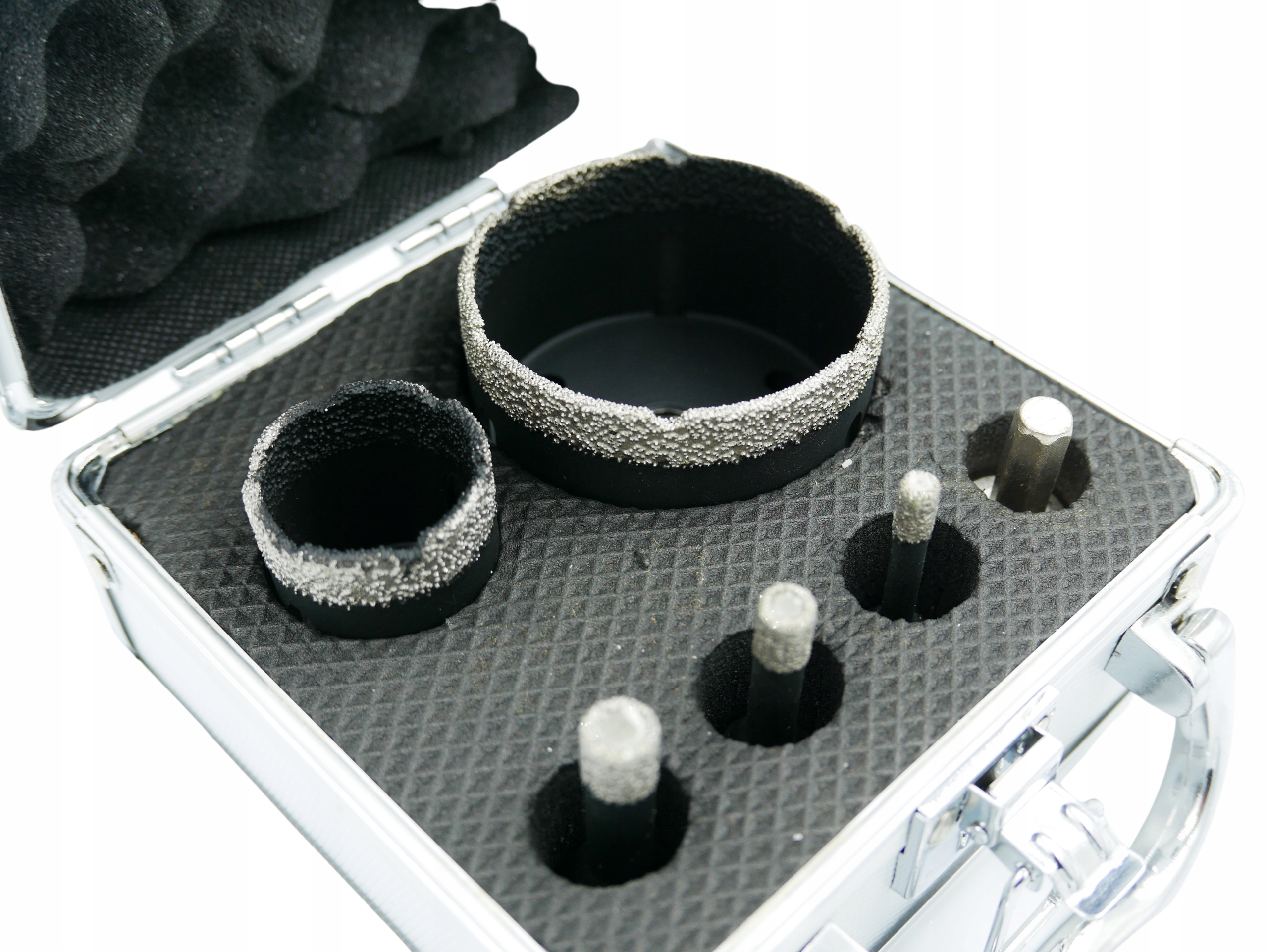 Набор алмазных коронок размером от 6 до 68 мм. Оснащен монтажной резьбой М14 для установки в угловые шлифовальные машины.