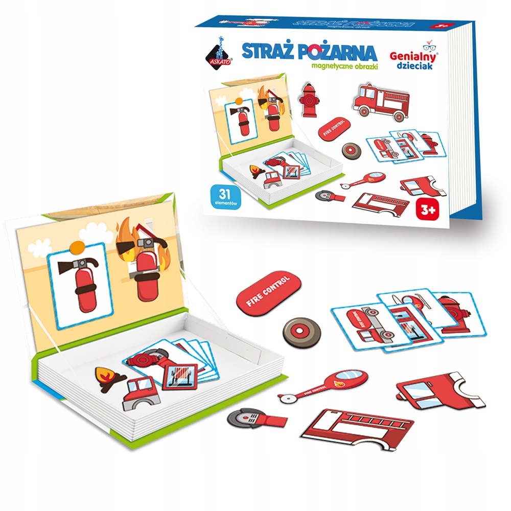 В набор входит коробка - доска, магнитные транспортные средства, карточки с изображениями пожарной техники и другие элементы пожарных принадлежностей.