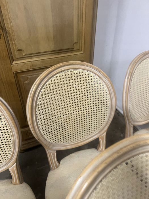 Предмет продажи — овальный раздвижной стол с 6 стульями-медальонами и 2 табуретками. Хорошее состояние. Устойчивые кресла-медальоны, сиденья на пружинах. Обивку необходимо заменить или постирать, местами потерта. Рафия в очень хорошем состоянии. Конструктивно стол в очень хорошем состоянии, внутри есть вставка, на столешнице в одном месте есть потертости краски, что видно на фотографиях. В комплект также входят 2 табурета. Возможность покупки в рассрочку. Возможен транспорт или личное получение. Товар в наличии в магазине в Пионках.