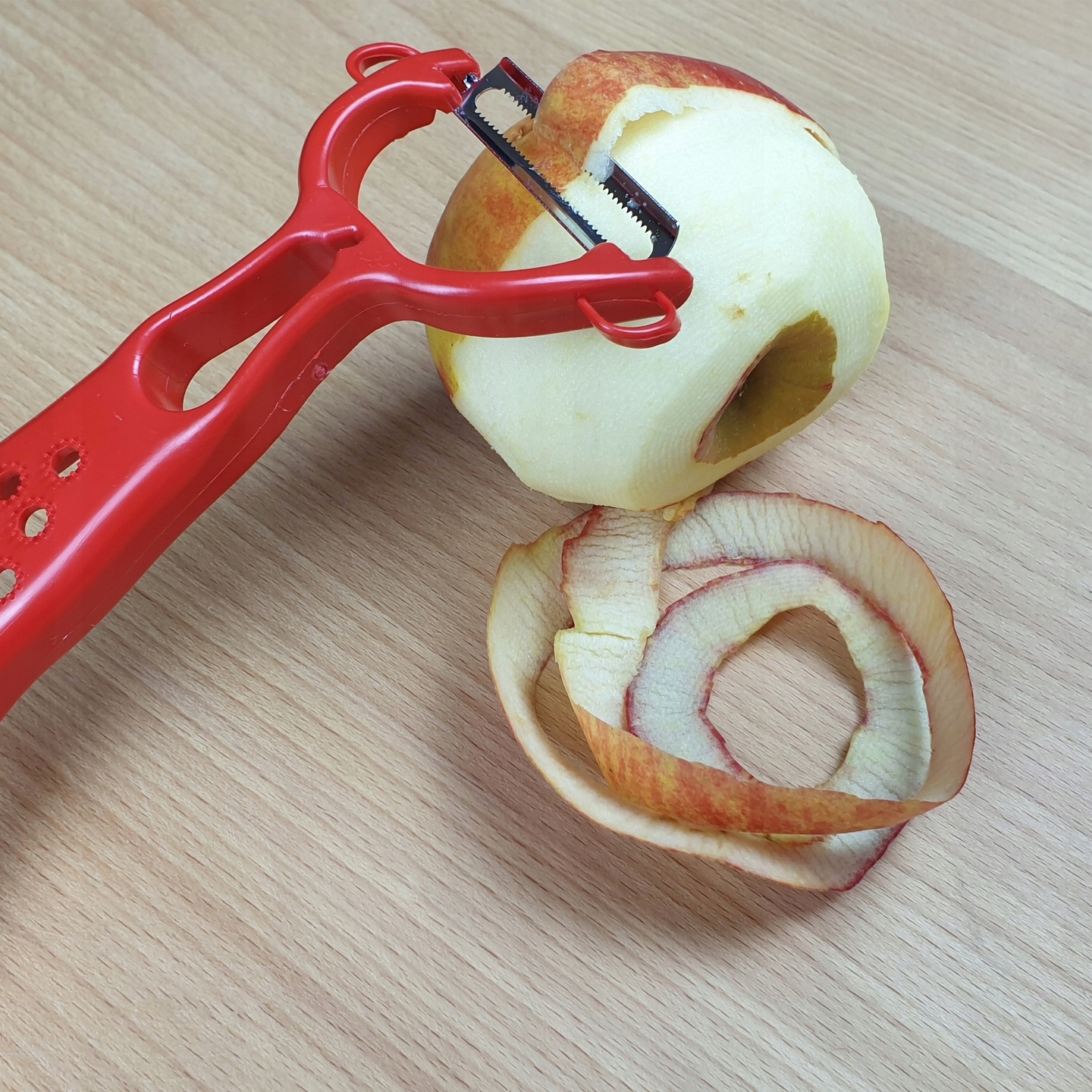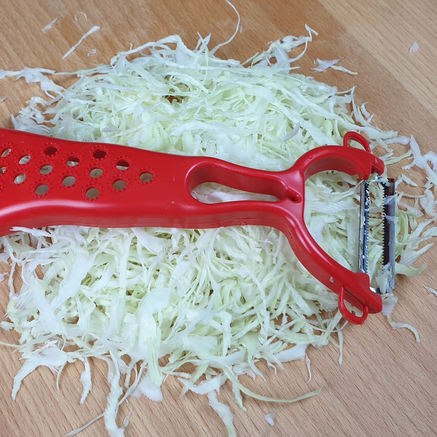 Очистка оснащена лезвиями с обеих сторон, как показано на рисунке. фотографии. С одной стороны очень острое, нетупое, зубчатое лезвие. С помощью которого можно очень тонко очистить овощи и фрукты. Вы также можете шинковать как белокочанную, так и красную капусту. Устройство работает в обе стороны.