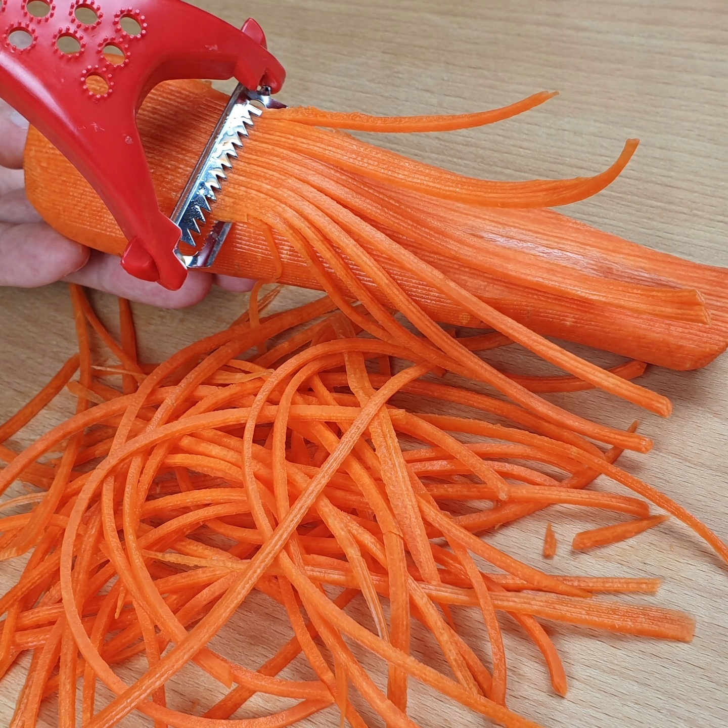 С другой стороны расположено лезвие «Жульен». С помощью этого ножа можно нарезать твердые овощи и фрукты на длинные и короткие соломки «жульен». Благодаря ему можно быстро и легко приготовить морковь, лук-порей, сельдерей, свеклу, картофель, белую редьку для салатов, китайских блюд и многих других блюд, получив чудесный и вкусный эффект.