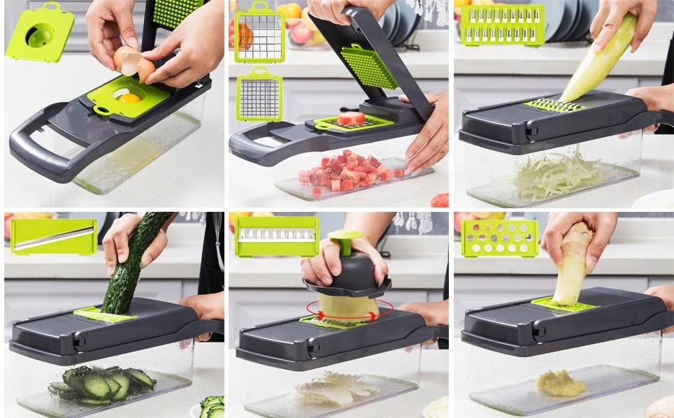 ▶️Наша овощерезка имеет многофункциональный дизайн. Ручной слайсер очень удобен в использовании, вы можете испытать радость переключения одним щелчком мыши и удовлетворить свои кухонные потребности в нарезке овощей во многих аспектах, таких как нарезка, измельчение и нарезка кубиками.