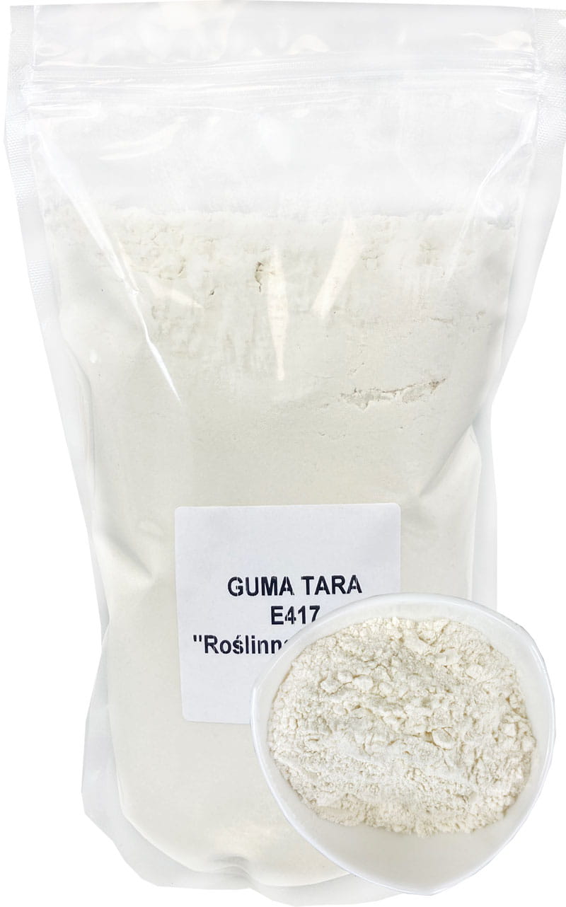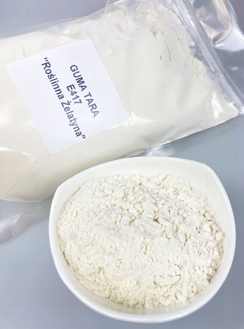 Tara Gum (E417) является естественным дополнением, полученным путем измельчения интерьера Семена Цазальпинии Спиноса, из семейства бобов. Резина Тары, также называемая Перуанский рож Горячая вода и частично растворяется в холодной воде.