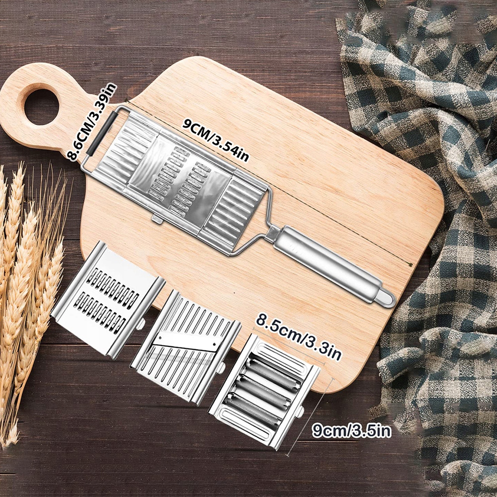 2. Быстро выполните задачу: многофункциональный набор резки для овощей изготовлен из прочной, пищевой нержавеющей стали, прочной и устойчивой ржавчины, он может непосредственно касаться пищи, быстро выполняет задачу и обеспечивает долгий срок службы на вашей кухне. Если вы хотите заменить Slicer, вы можете просто надеть его и удалить его. Если вы ищете высокое качество и экономящую сырную территорию, эта ручная терпимость из нержавеющей стали - отличный выбор! 2. 3. Сделано из высококачественной нержавеющей стали, текстура твердая и резкая. Сплошная рама из нержавеющей стали более долговечна, чем обычная пластиковая террация. Устойчивый к отдыху, защищает кухню от ржавчины и сохраняет ее чистой и гигиеной. Это терпимость из нержавеющей стали имеет сплошную ручку со слегка профилированным профилем, чтобы сбалансировать руку, и анти -скольжение на другом конце, чтобы предотвратить скольжение на деревянной рубке.