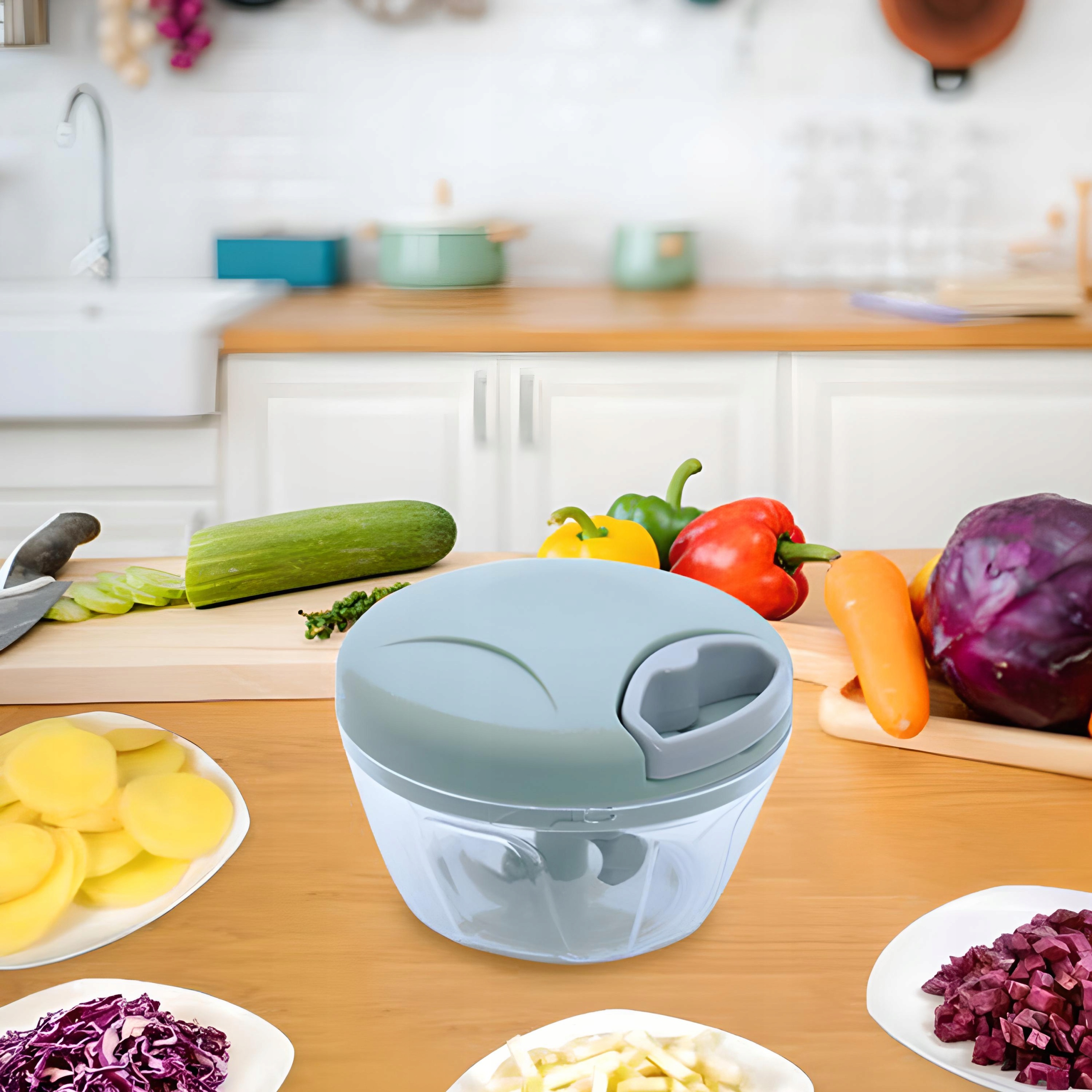 Просто бросьте овощи в контейнер, закройте крышку и потяните ручку - лезвие сделает все остальное!