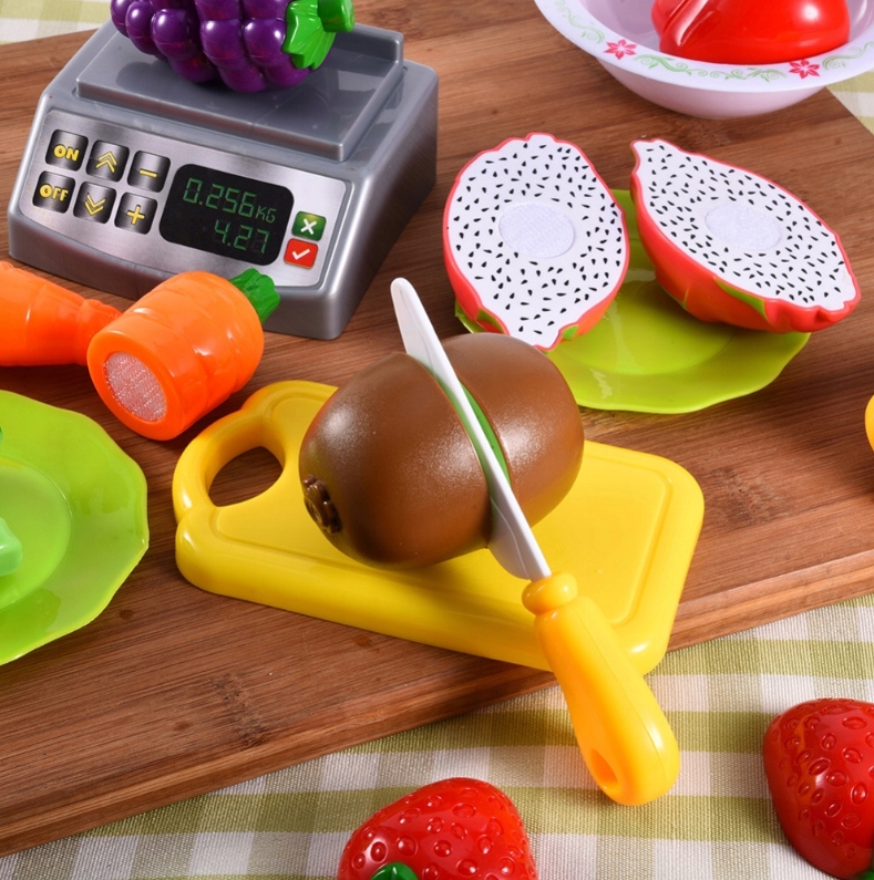 Фрукты и овощи можно «резать» ножом, идущим в комплекте, тогда они легко комбинируются с помощью внутренней липучки. Корзина имеет практичные ручки, поэтому комплект можно легко переносить.