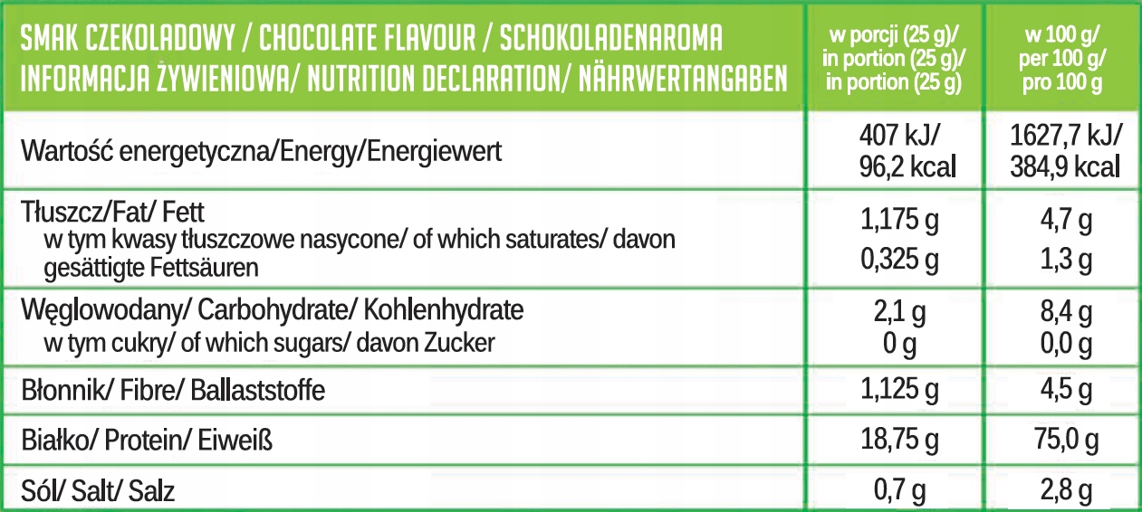 Состав: смесь растительных белков (87,5% изолята горохового белка, 12,5% изолята рисового белка), какао, загуститель: гуммиарабик; шоколадный ароматизатор, загуститель ксантановая камедь; Аромат ванильно-сливочный, подсластитель: сукралоза, регулятор кислотности: лимонная кислота, подсластитель: ацесульфам К.