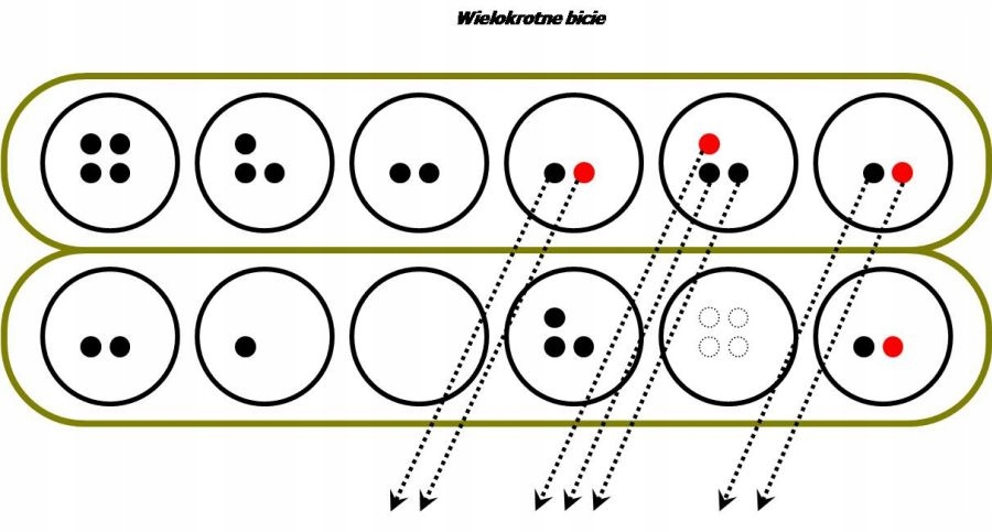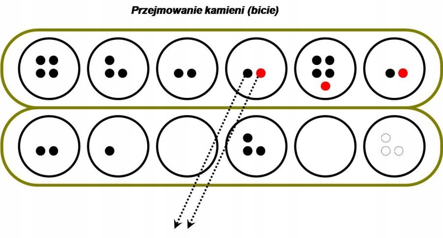Если последний камень попадает на клетку, дающую взятие (захват), и предыдущие клетки также содержат два или три камня (в любой комбинации) – эти камни также захватываются (множественный захват).