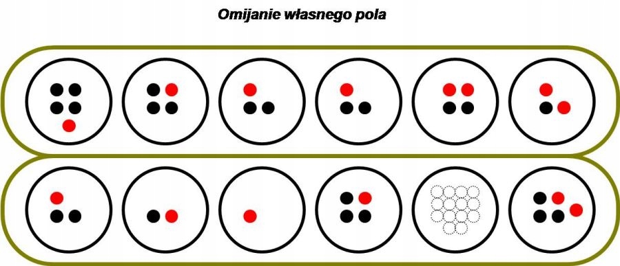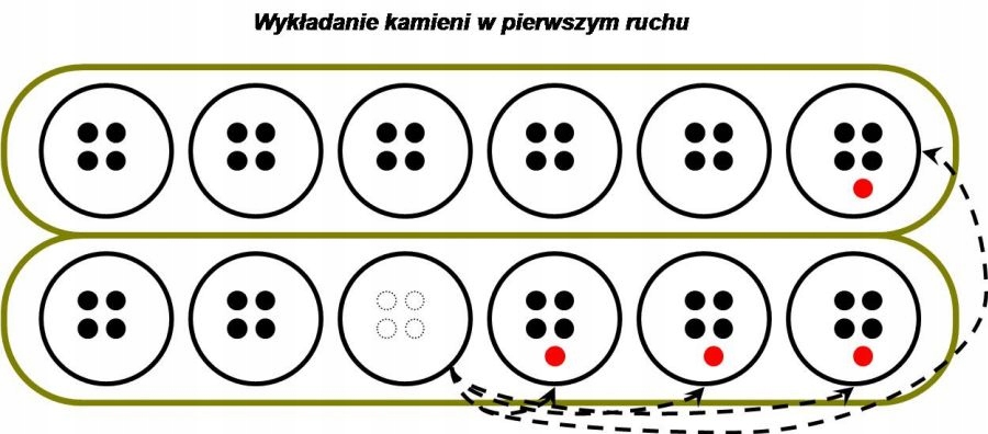 Исключением являются случаи, когда на игровом поле находится более 11 камней. Размещая камни на последующих полях, доходим до того поля, с которого начали разбрасываться после полного обхода доски. Это поле опускается, и последующие камни размещаются следующими, начиная со следующего по порядку.