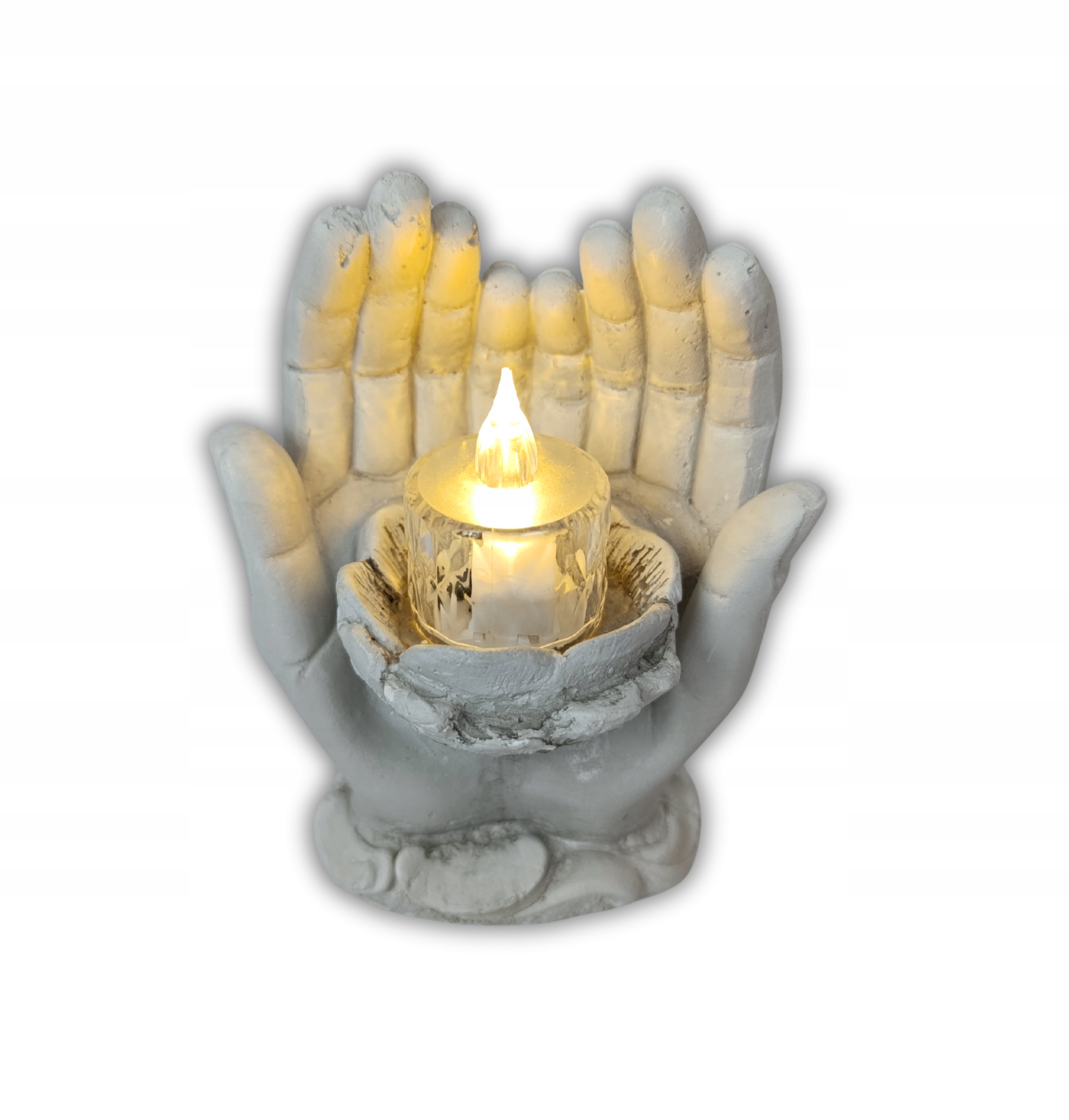 Эстетическая свеча из штукатурки, изображающая две руки, окружающие свет свечи. Универсальная форма и подчиненный, натуральный цвет делают его идеально подходящим как могила или декоративный элемент дома.