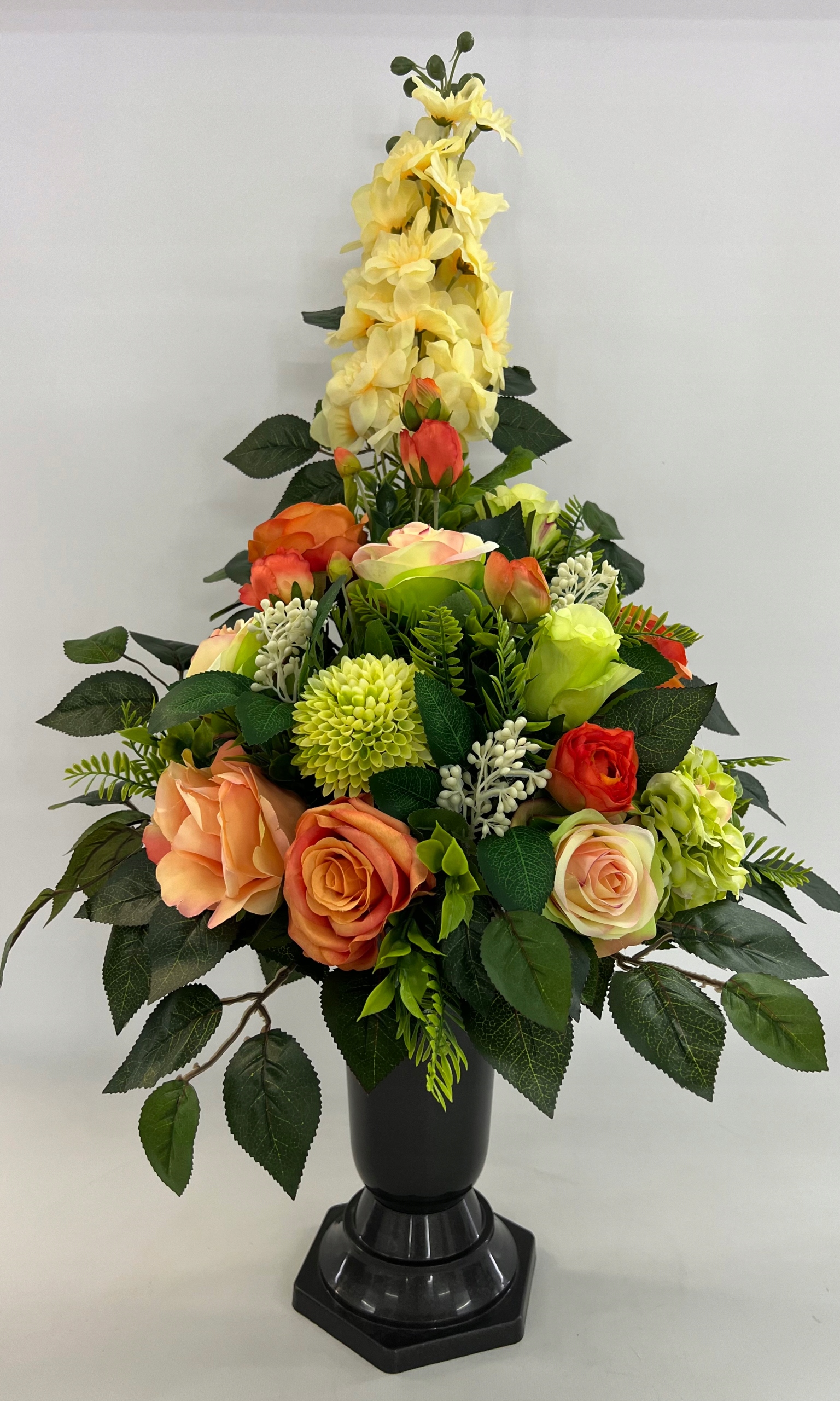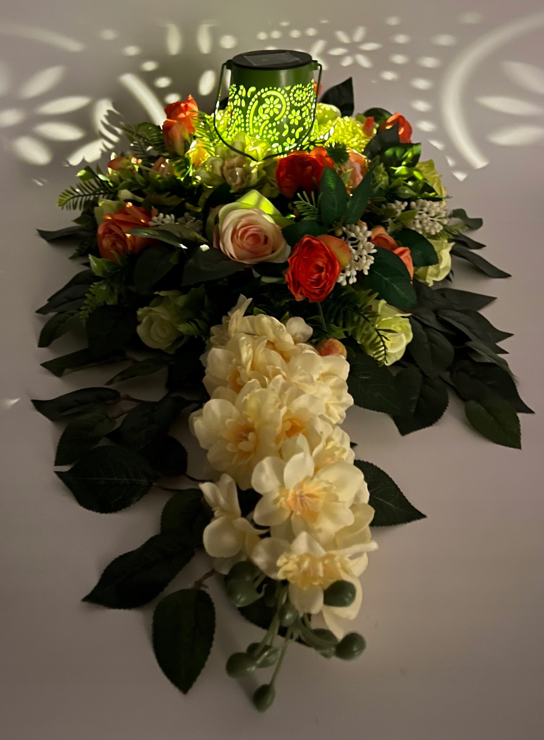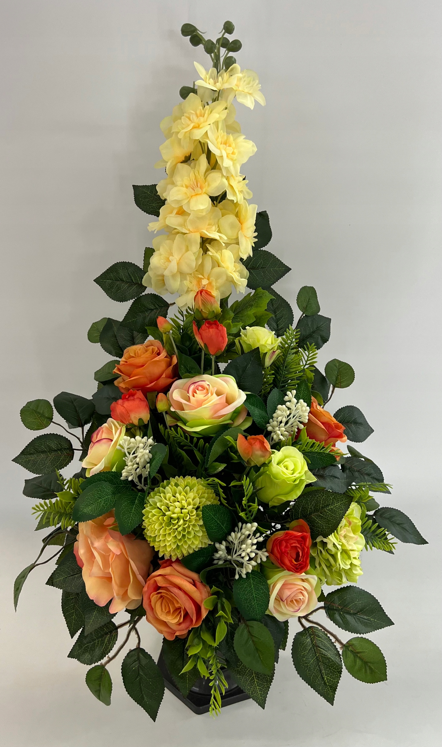 Надгробие, помещенное в хорошо нагруженный горшок, наполненный бетоном. Качественные цветы и зеленая фурнитура придают украшению реалистичный вид.