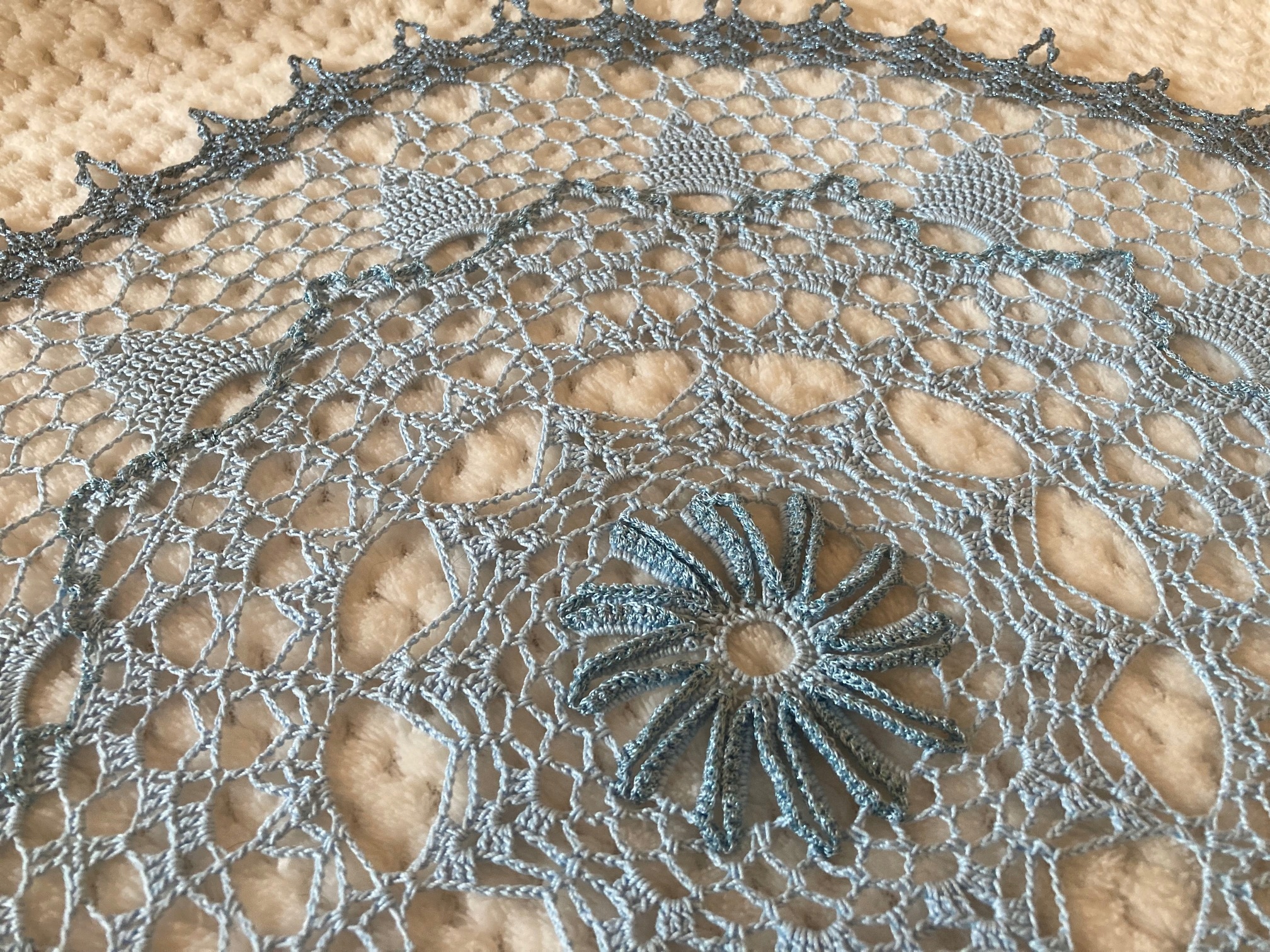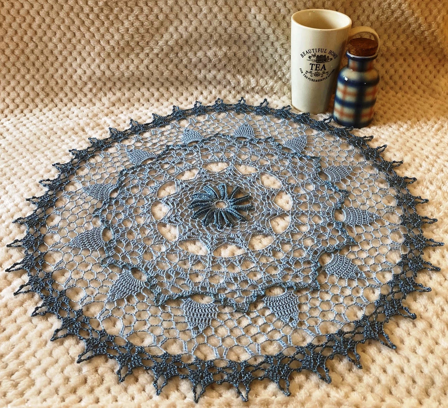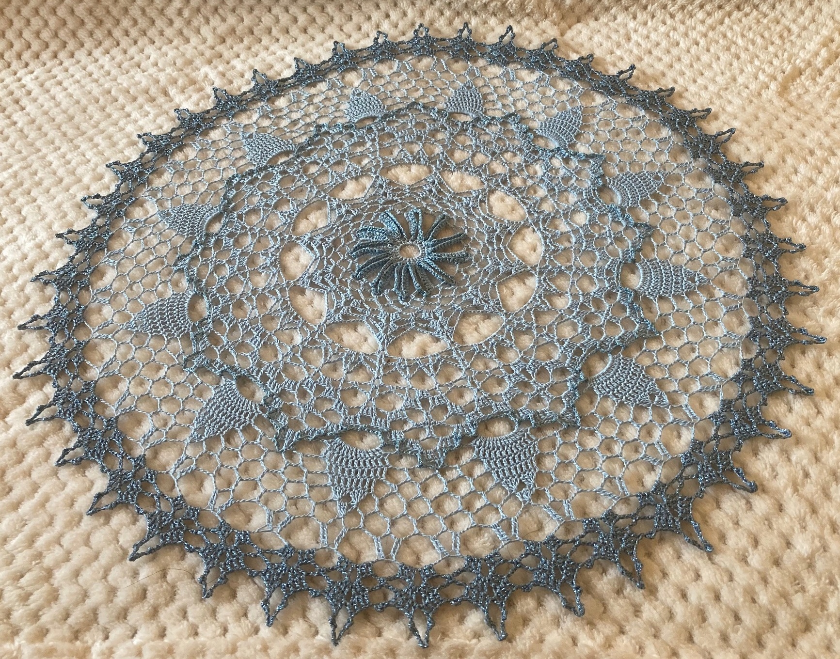 Ozdobna Serweta Okrągła Obrusik 53 cm Błękit i Srebrzysty Blask Handmade