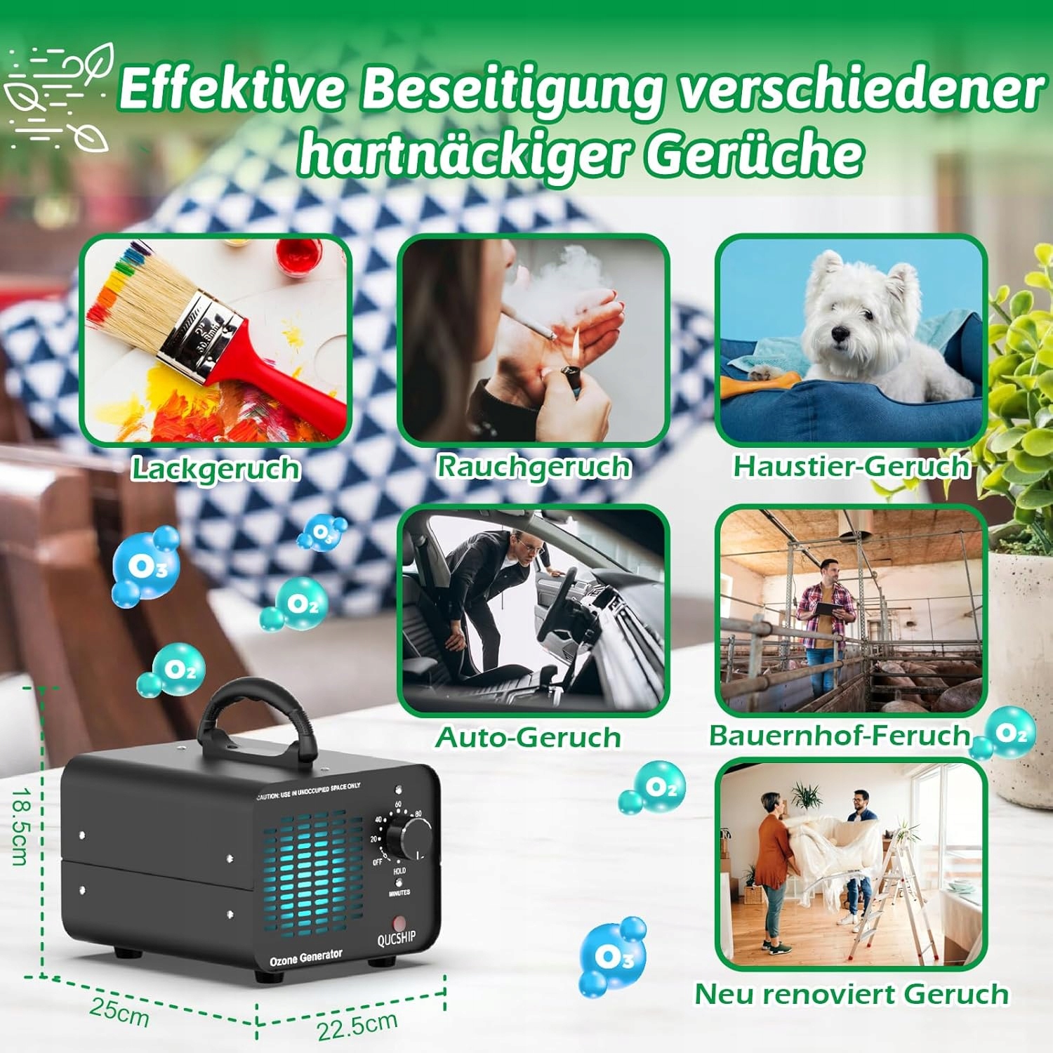 - эффективный генератор озона : Qucship Ozone Generator использует свой собственный эффективный вентилятор для быстрого распределения озона в комнате. Он реагирует с вредными веществами и быстро превращает их в свежий кислород.
