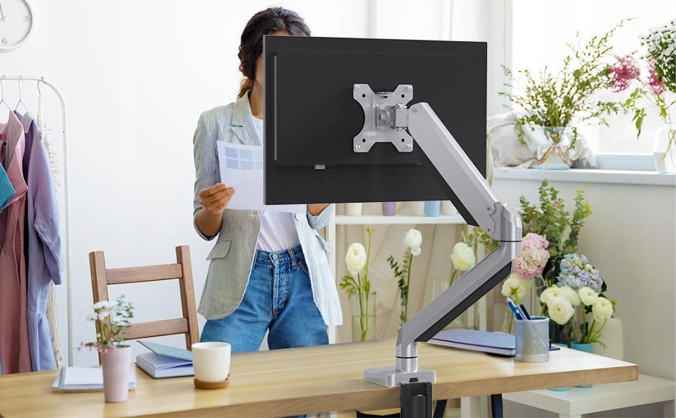 Мониторинг рычага с помощью газовой пружины с противовесом позволяет настроить напряжение, чтобы настроить его на вес монитора, чтобы вы могли легко перемещаться или оставить его в любом положении у ваших рук. Кроме того, его можно регулировать гораздо быстрее и позволяет как горизонтальное, так и вертикальное движение. Его легче регулировать и каждый раз держать экран под идеальным углом обзора.