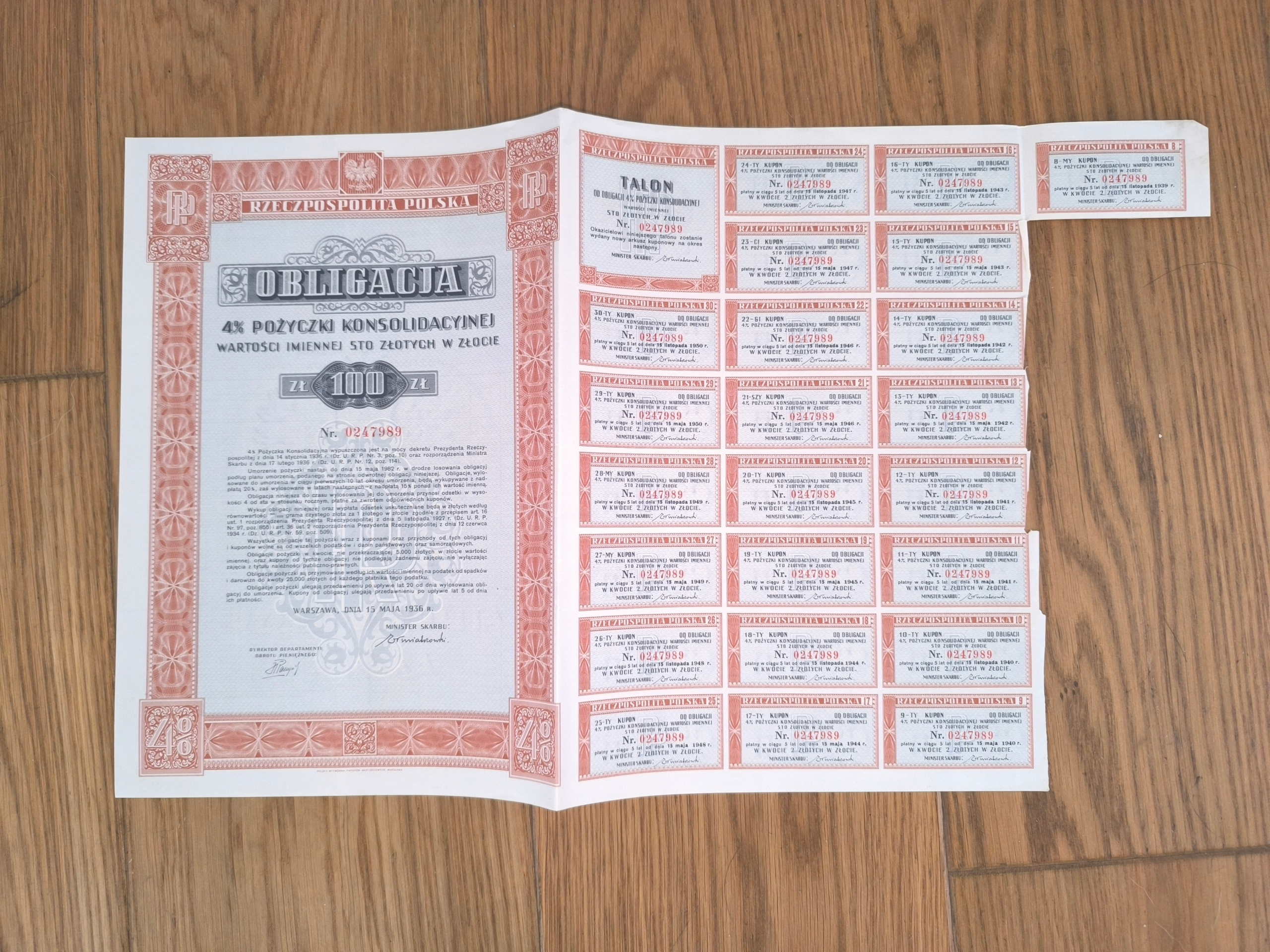 ОБЛИГАЦИИ 1936 ГОДА P13#4%. ЗА 100 ЗЛОТЫХ В ЗОЛОТЕ
