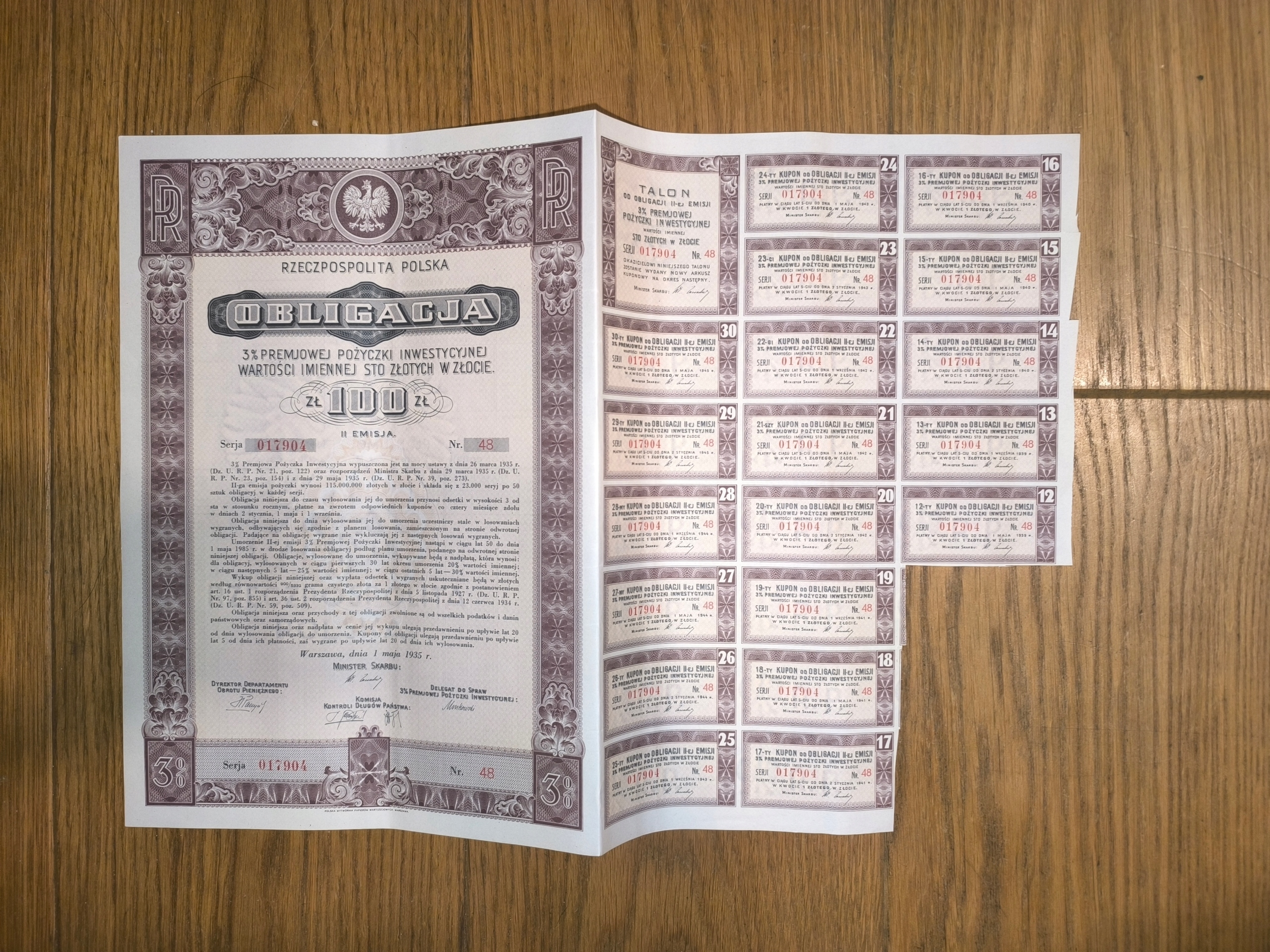 ОБЛИГАЦИИ P14 № 1935 ГОДА. 100 ЗЛОТНЫХ В ЗОЛОТОМ, КОРИЧНЕВОМ