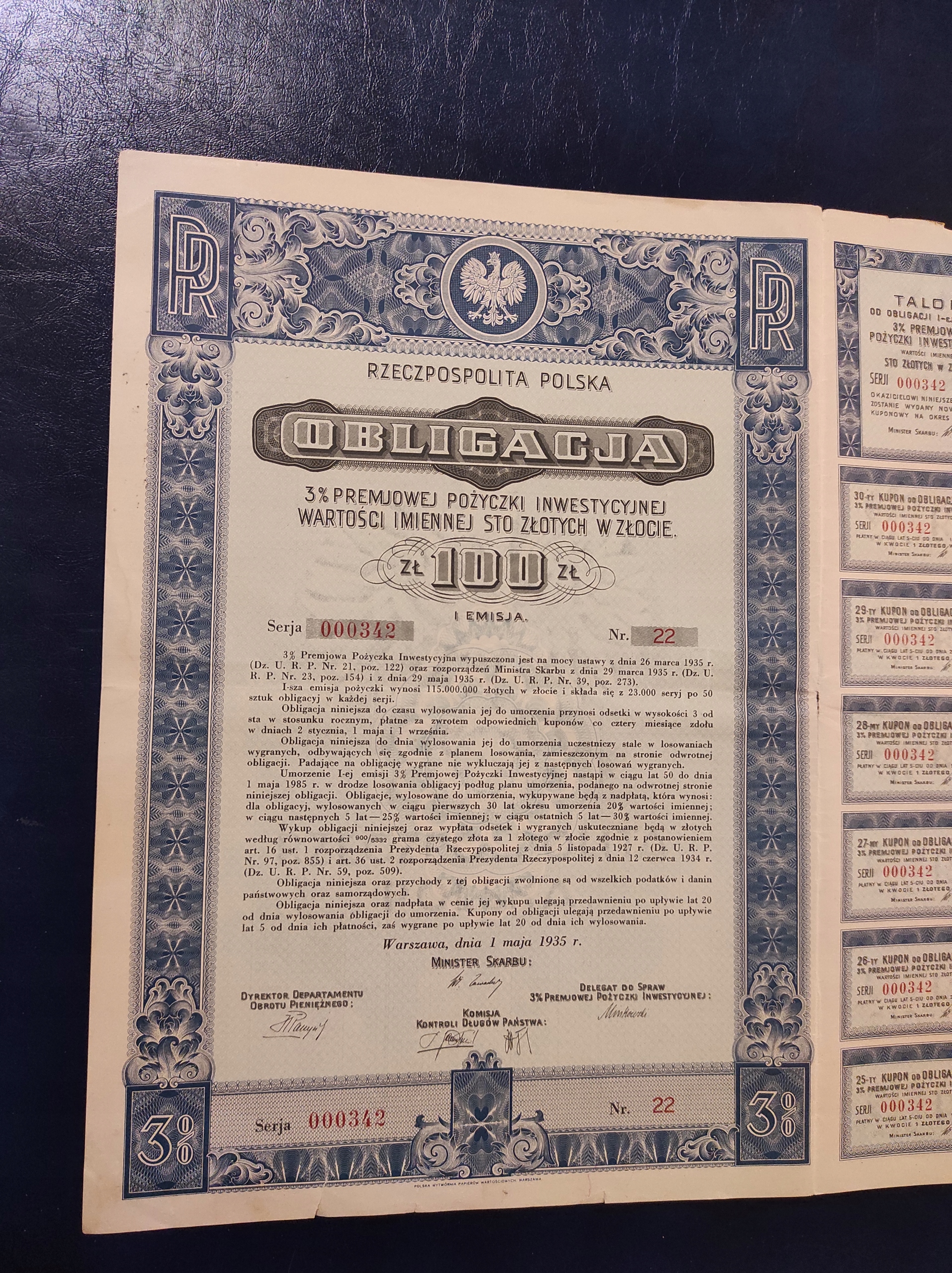 P15# OBLIGACJA Z 1935R. 100 ZŁ W ZŁOCIE NIEBIESKA