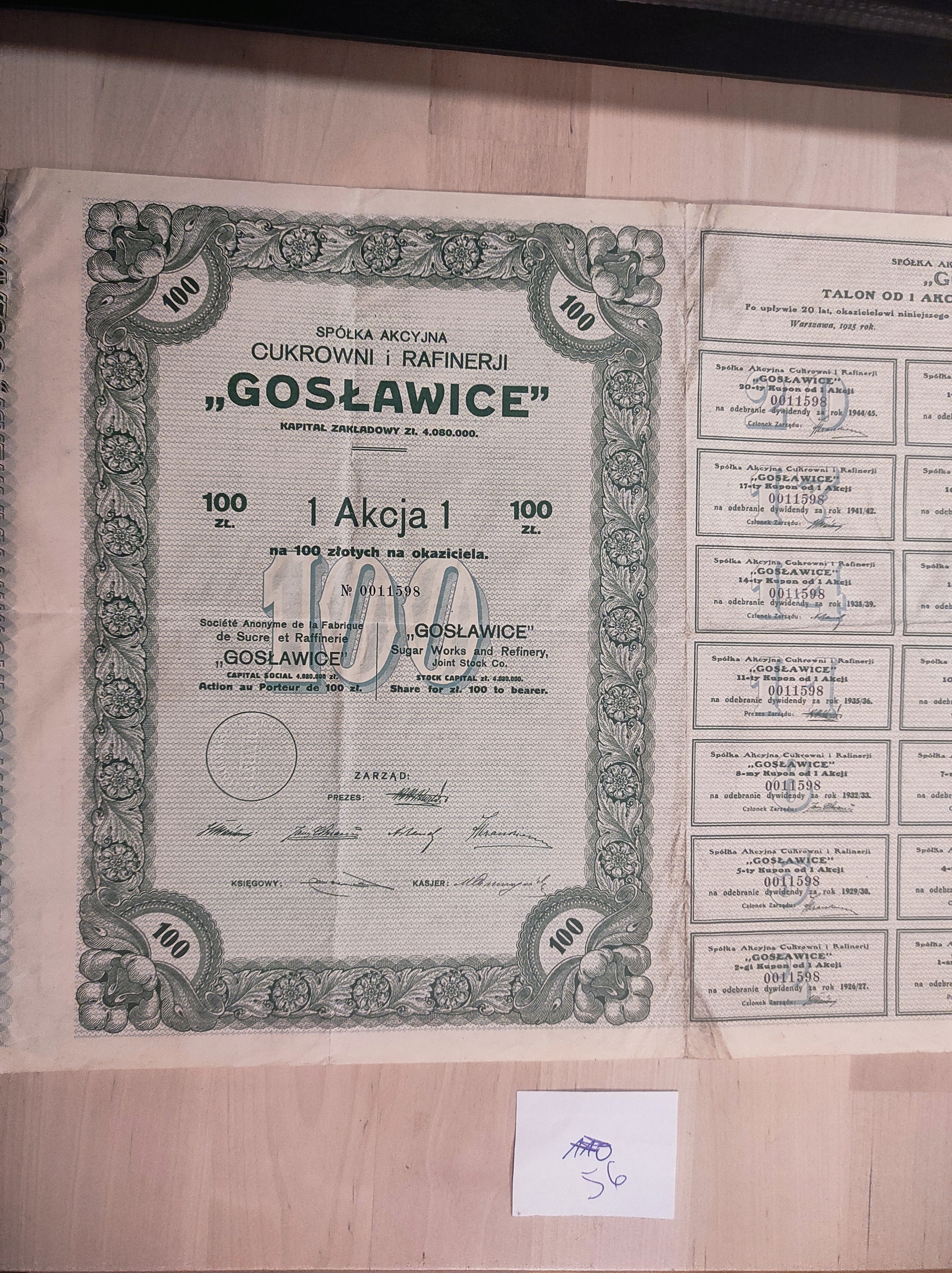 в 1938 году. Акционерный капитал компании составил 5,1 миллиона человек, разделенная на 40,8 тысяч. Акции с номинальным значением PLN 125 каждый. В сезоне 1936/1937 года было произведено 55 754 Q, преобразовав 310 512 Q. Площадь плантации была тогда 1348 га. Он работал под названием Zuckerfabrik und Rafinerie "Goslawitz" Aktiengesellschaft [3]. Железнодорожная сеть сахарной фабрики была захвачена PKP