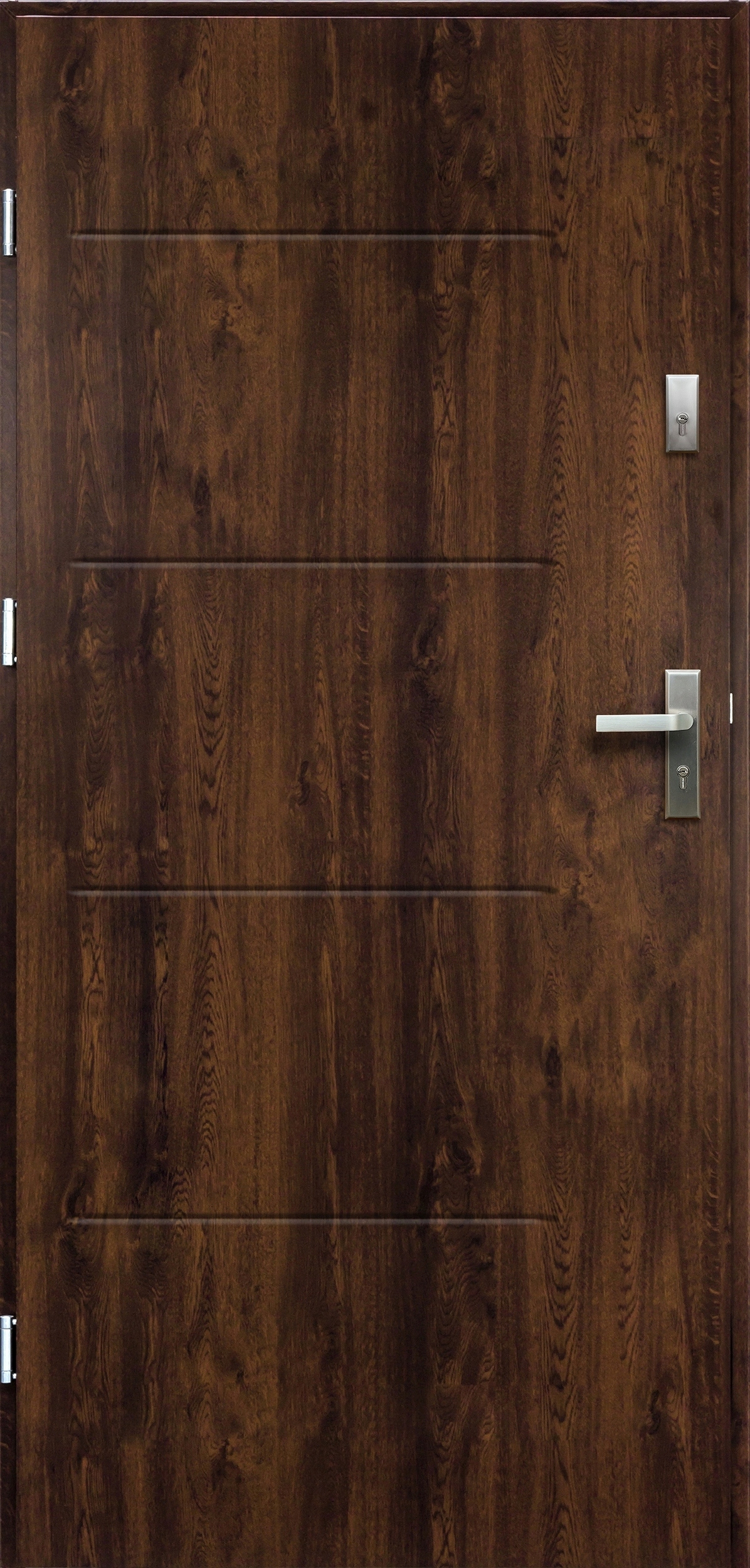 Двери толщиной 55 мм, из стали, покрытые декоративной пленкой со структурой и цветом дерева, устойчивые к УФ-излучению.