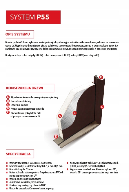 Двери толщиной 55 мм, из стали, покрытые декоративной пленкой со структурой и цветом дерева, устойчивые к УФ-излучению.