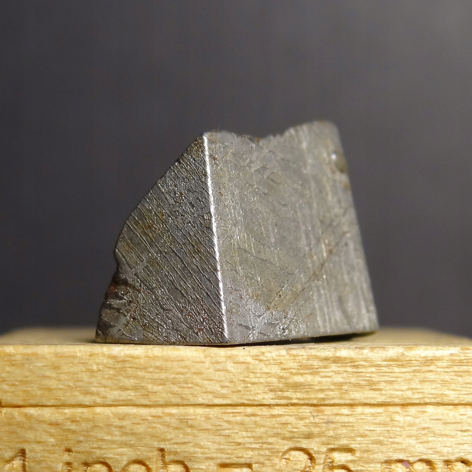Разрезанный фрагмент метеорита. Очень хорошо видны фигуры Видманштеттена (характерный узор из параллельных ламелей камасита и тэнита).