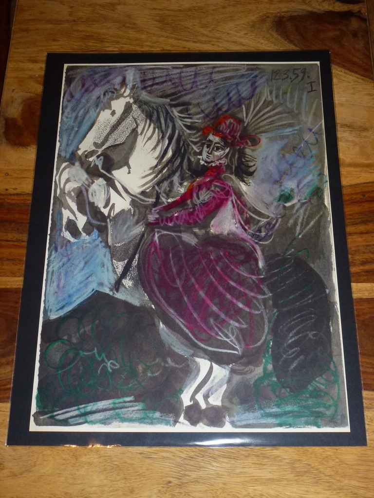 Я должен предложить смещенную литографию, опубликованную в 1961 году Банкой Пополаре ди Милано (Милан, Италия), иллюстрирующий цикл Пабло Пикассо "Торос Y Toreros" (быки и торадоры). Это редкое итальянское первое издание цикла 1961 года (выпущенное с автором и в течение жизни автора). Studio в Париже отвечает за печать. Выпуск на высококачественных акварельных архи, другая сторона карты чистая. Иллюстрация представляет вторую жену П. Пикассо - Жаклин. положение никогда не связано, очень хорошее поведение .