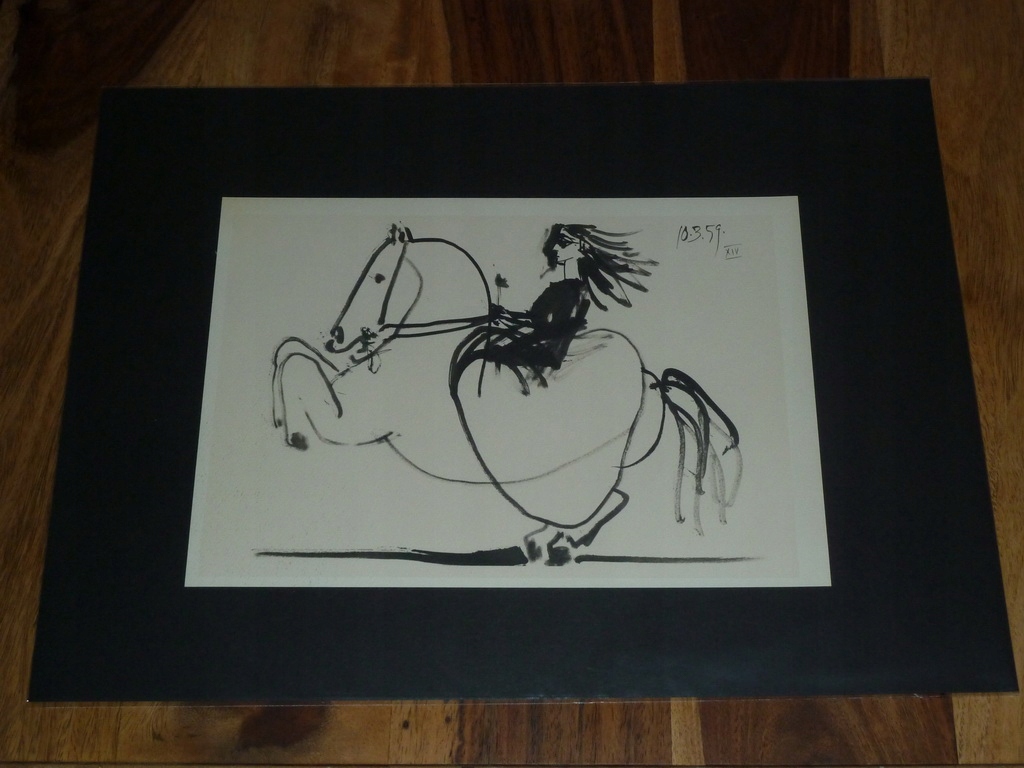 Я должен предложить смещенную литографию, опубликованную в 1961 году Банкой Пополаре ди Милано (Милан, Италия), иллюстрирующий цикл Пабло Пикассо "Торос Y Toreros" (быки и торадоры). Это редкое итальянское первое издание цикла 1961 года (выпущенное с автором и в течение жизни автора). Studio в Париже отвечает за печать. Выпуск на высококачественных акварельных архи, другая сторона карты чистая. Иллюстрация представляет вторую жену П. Пикассо - Жаклин. положение никогда не связано, очень хорошее поведение .