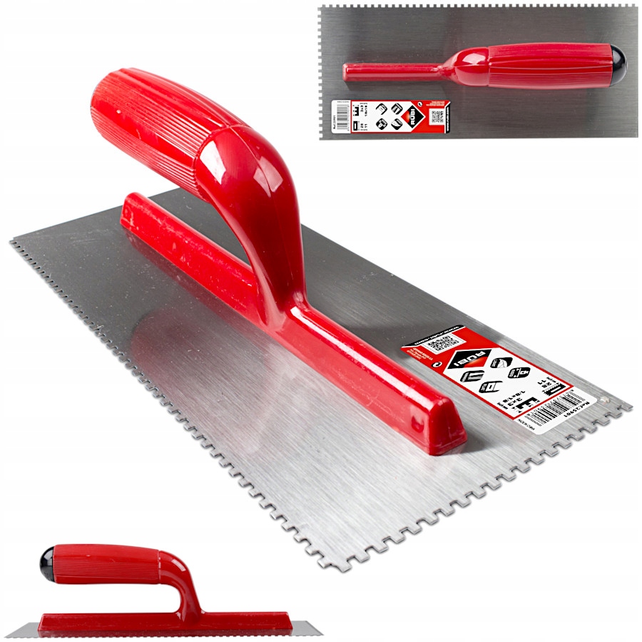 - Кельма зубчатая с открытой пластиковой ручкой, изготовлена из комбинации двух материалов, имеет высокостойкую к истиранию основу и основу с защитным слоем прозрачного лака.