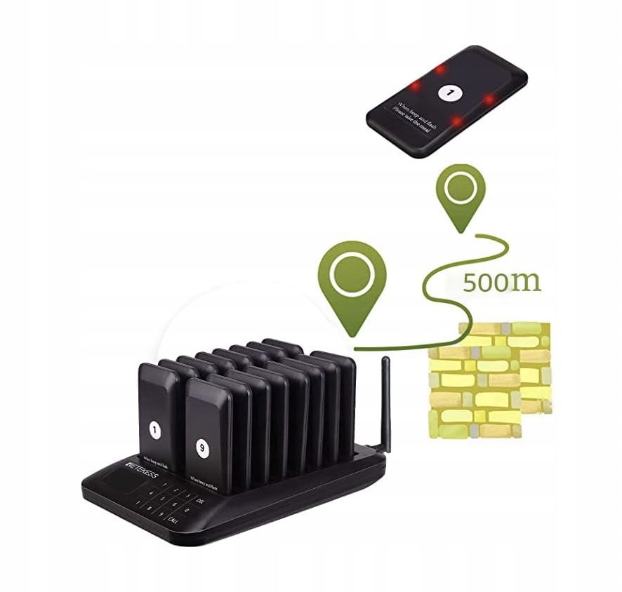 - Долгое время ожидания; Пейджер может работать 20 часов после зарядки; дальность связи на открытой поверхности составляет примерно 300 метров; достаточно для использования в ресторане или на улице.