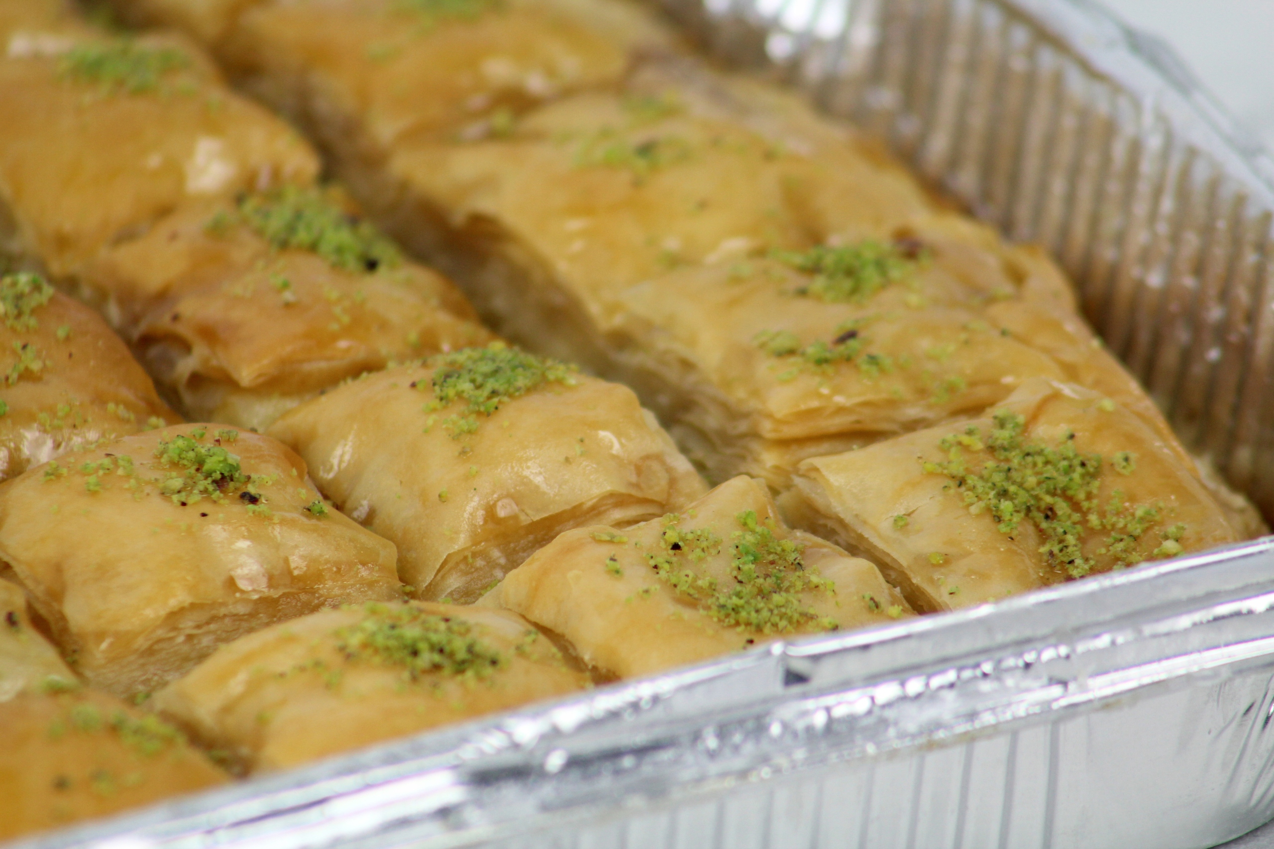 Классическую пахлаву готовят из листового теста, которое иногда называют корой (балканское название) или печеньем фило (греческое название). .- прослоены измельченными орехами (грецкими или миндалем) с сахаром или медом. Все запечено. После выпечки его разрезают на ромбы, треугольники, квадраты и другие формы, а затем покрывают глазурью или сиропом из воды, сахара и лимонного сока. Сверху посыпаем измельченными несолеными фисташками.