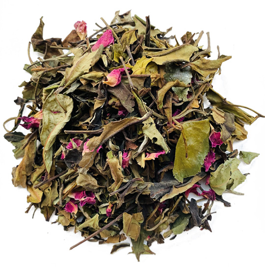 Белый чай оригинального написания китайский 白茶 с добавлением сушеных лепестков роз. Ароматическая смесь создана на основе сорта одного из лучших белых чаев Пай Му Тан. Чай из Китая, собирают ранней весной, когда кусты выпускают молодые листья. Собирают листовые почки и свежеразвившиеся чайные листья. Затем листья сушат на сильном весеннем солнце, благодаря чему окисление в листе происходит самопроизвольно и ограничивается примерно 10%.
