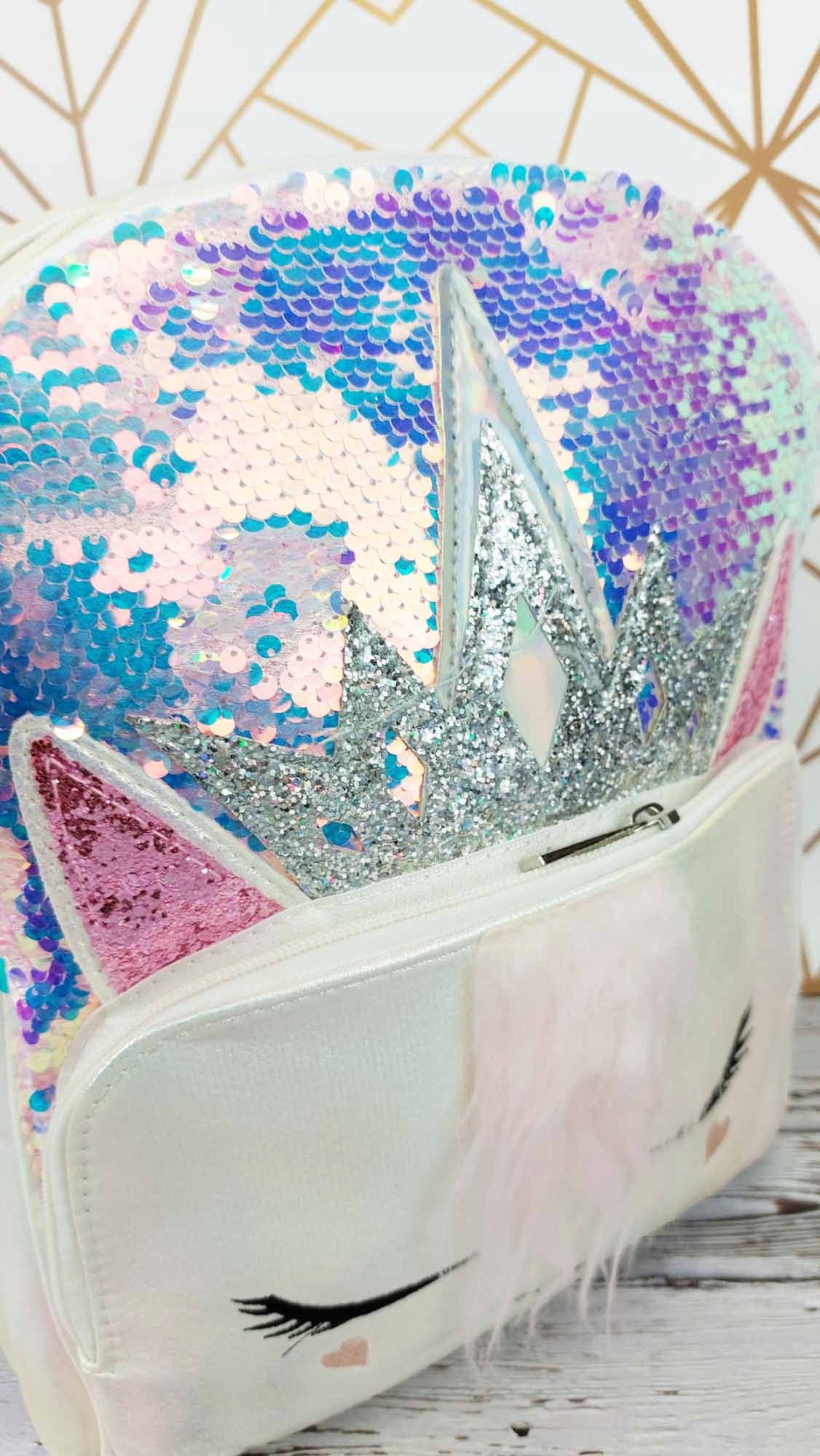 Рюкзак из переливающегося материала. Топ покрыт красивыми, волшебными пайетками, парчовая корона с голографическими вставками. Кроме того, впечатляющая грива единорога. Карман на молнии спереди. Внутри карман для мелочей на молнии. Регулируемая шлейка.