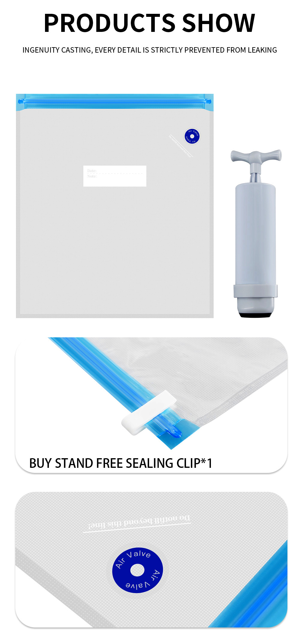 Чтобы правильно использовать предлагаемые сумки, вам необходимо следует приобрести насос для откачивания воздуха (создания вакуума в пакетах) и зажим, который поможет правильно закрыть пакеты перед откачкой воздуха - график ниже.