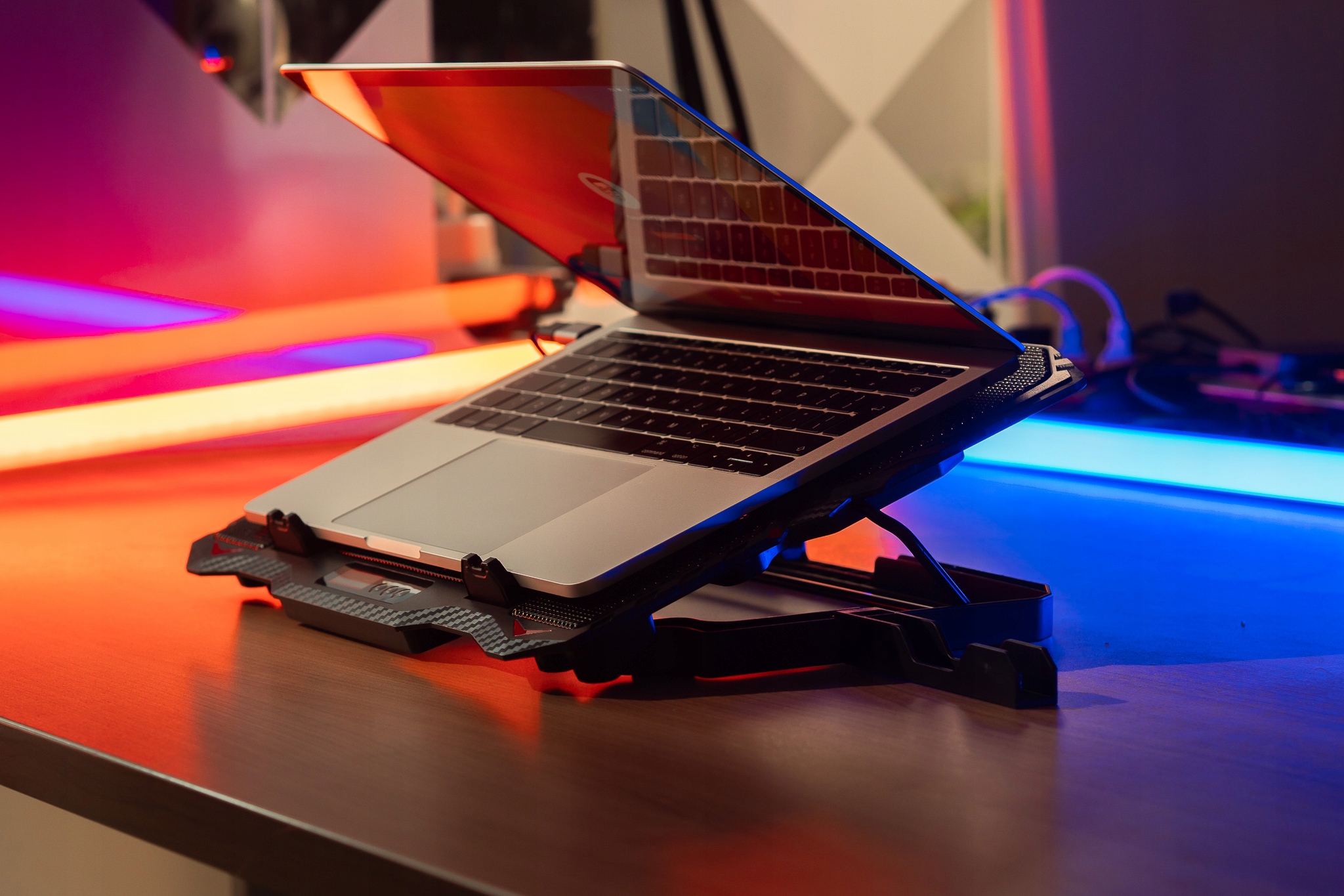подставка для охлаждения удара отличается от эффективного охлаждения благодаря используемому вентиляторам, который равномерно охлаждает ноутбук на всей поверхности подставки.