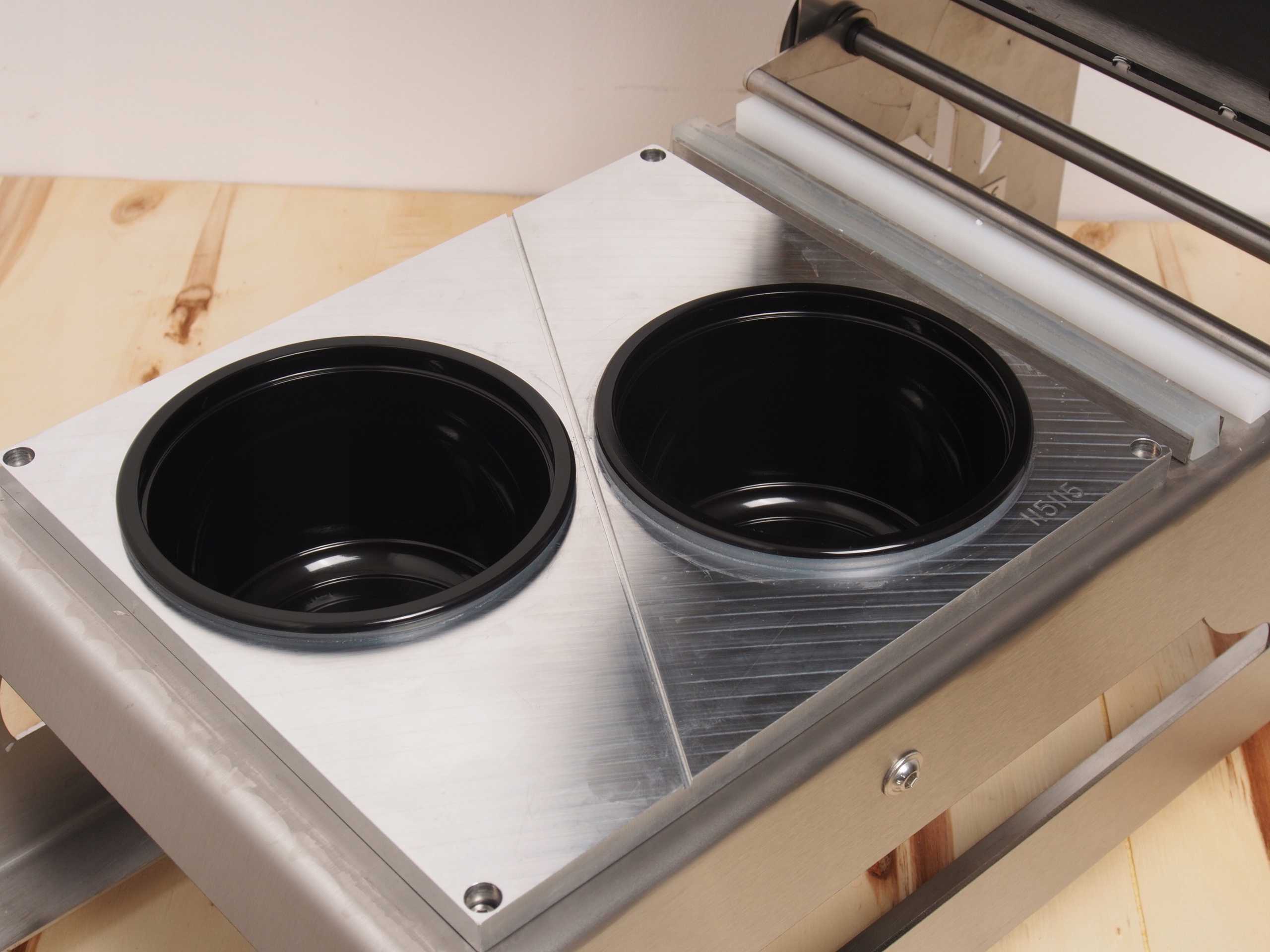 В комплект упаковочной машины входит универсальная неделимая матрица, с помощью которой мы можем упаковывать неразделенные лотки, разделенные на две и разделенные на три части.