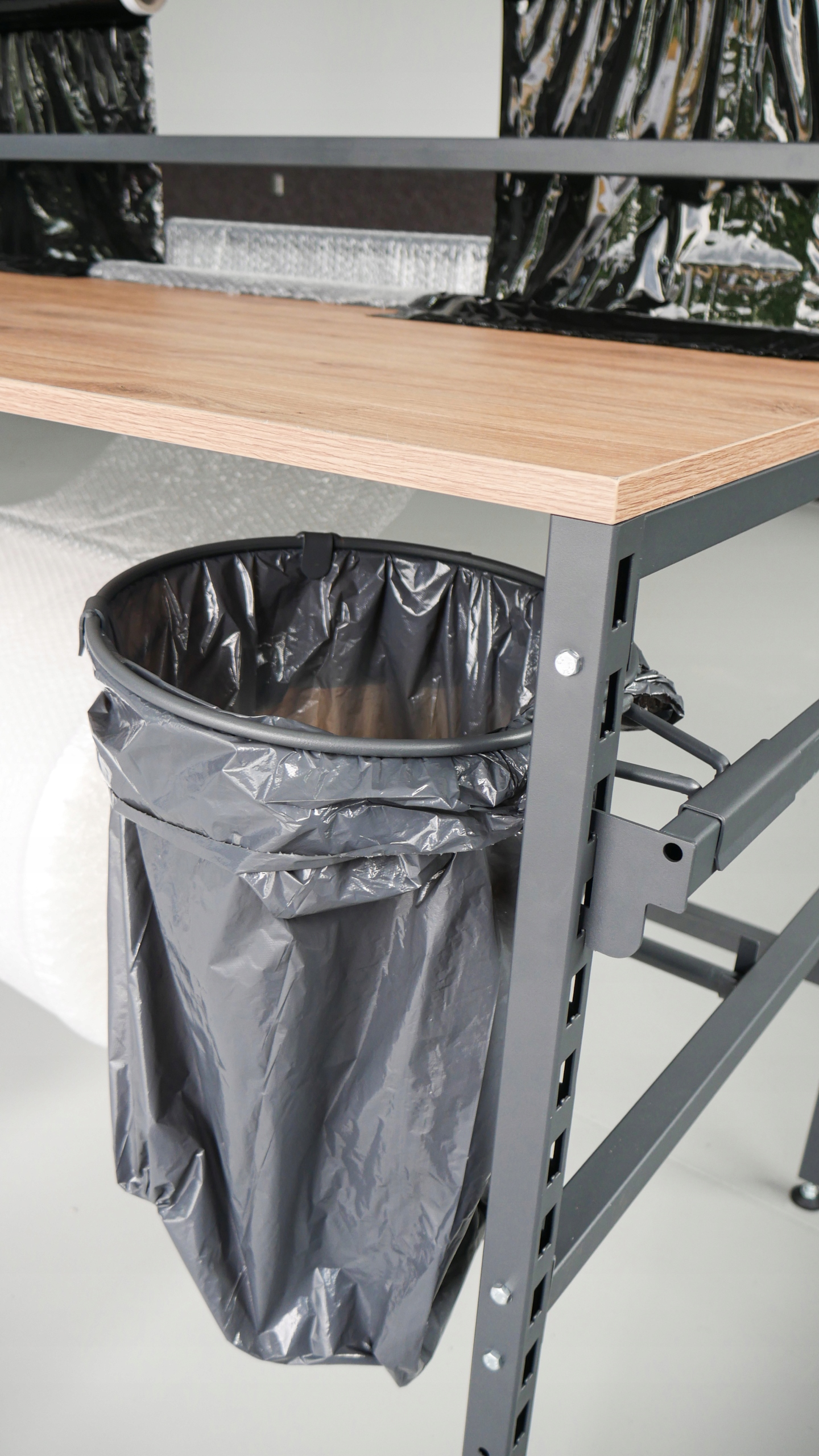 В процессе упаковки также задействовано большое количество отходов. Чтобы эффективно поддерживать чистоту на упаковочной станции, необходим держатель для ненужного мусора. Конструкция нашего стола позволяет иметь специальную ручку, на которую мы ставим сумку и выбрасываем остатки, оставшиеся после всего процесса упаковки.