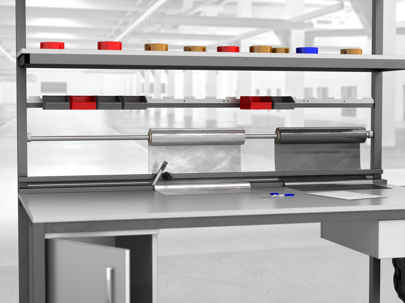 Любое расположение полок, освещения, шкафов , ящики, кабельные люверсы, ножки, колеса, раздвижные перегородки, нож фольга (цена уточняется)