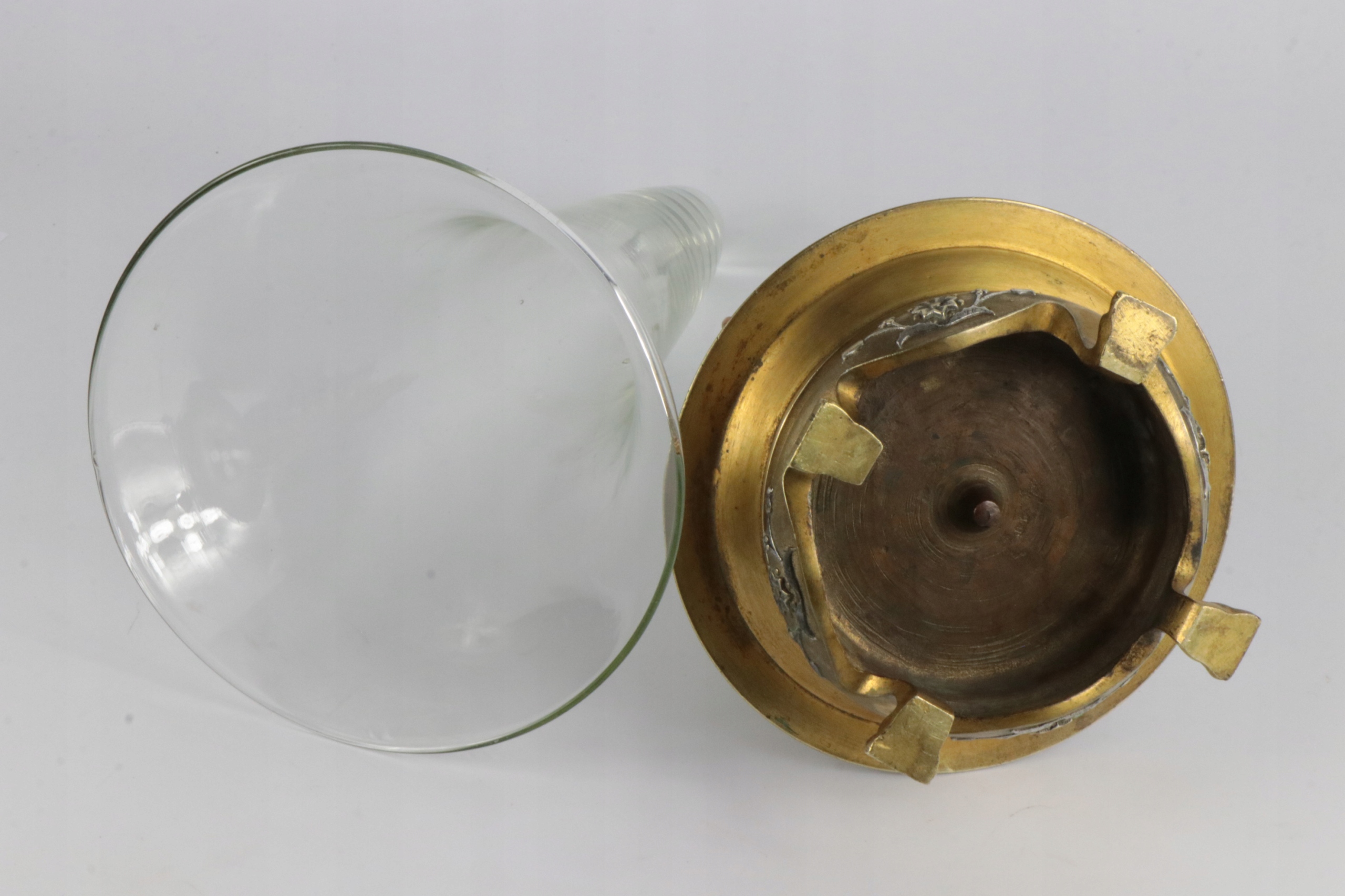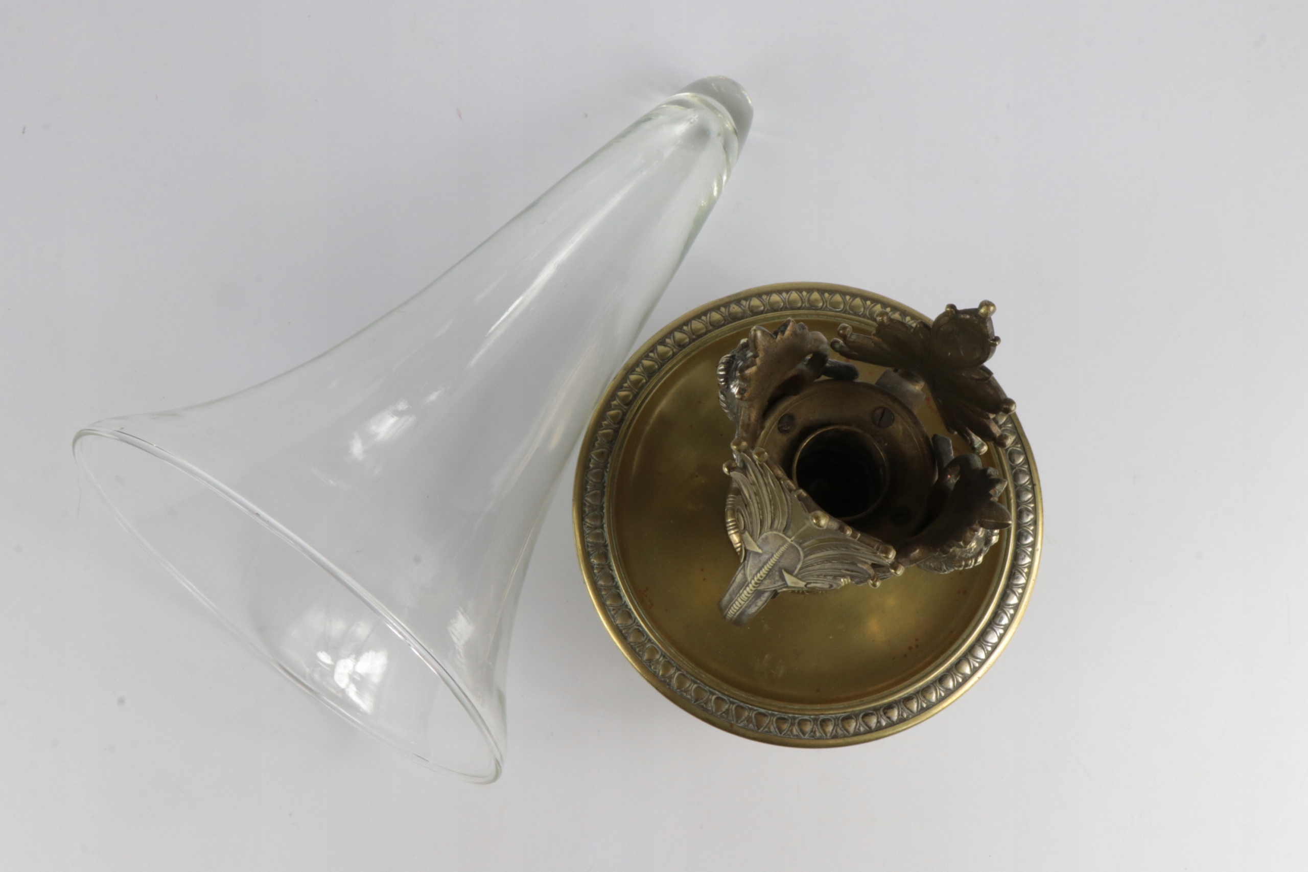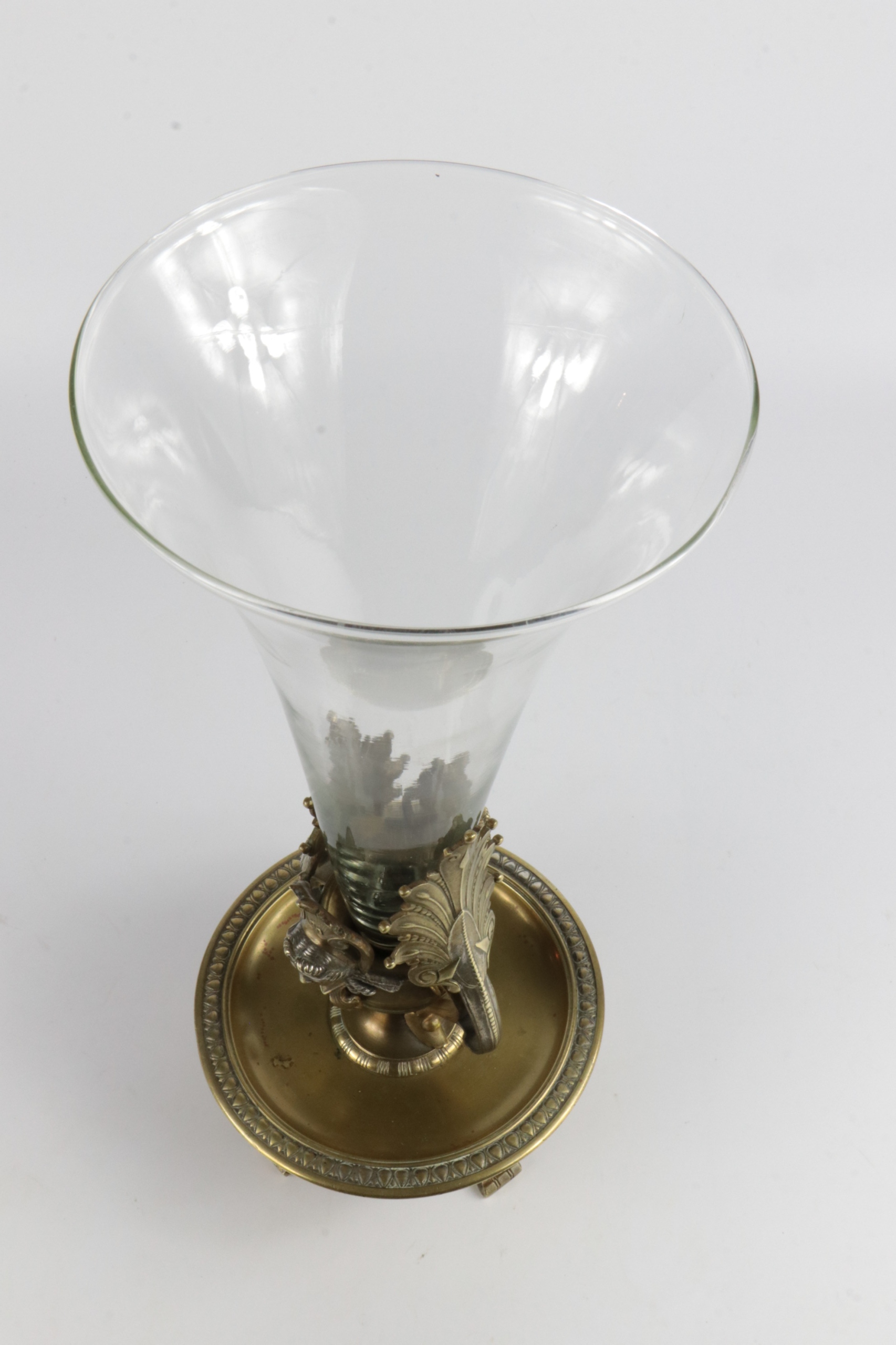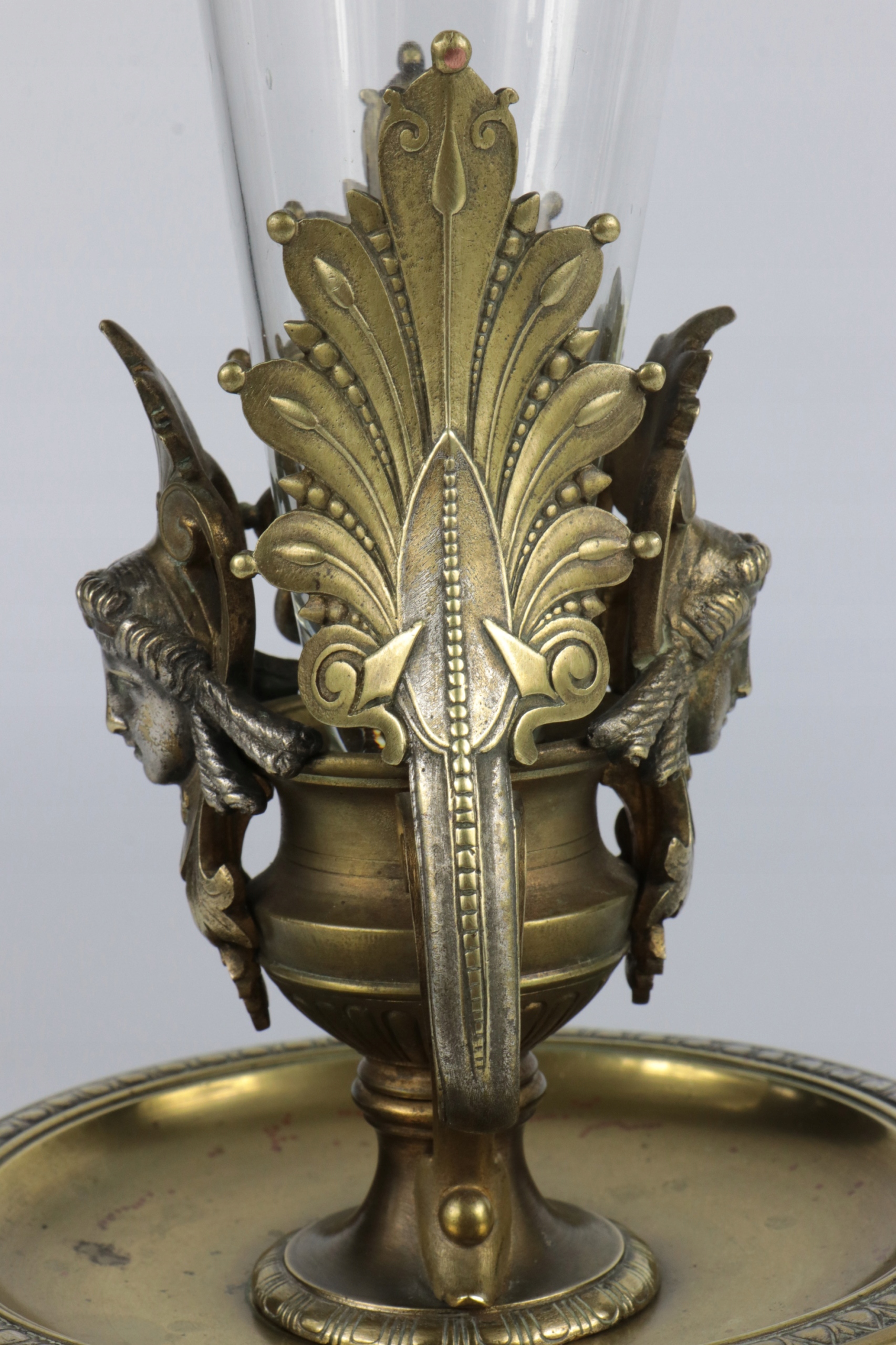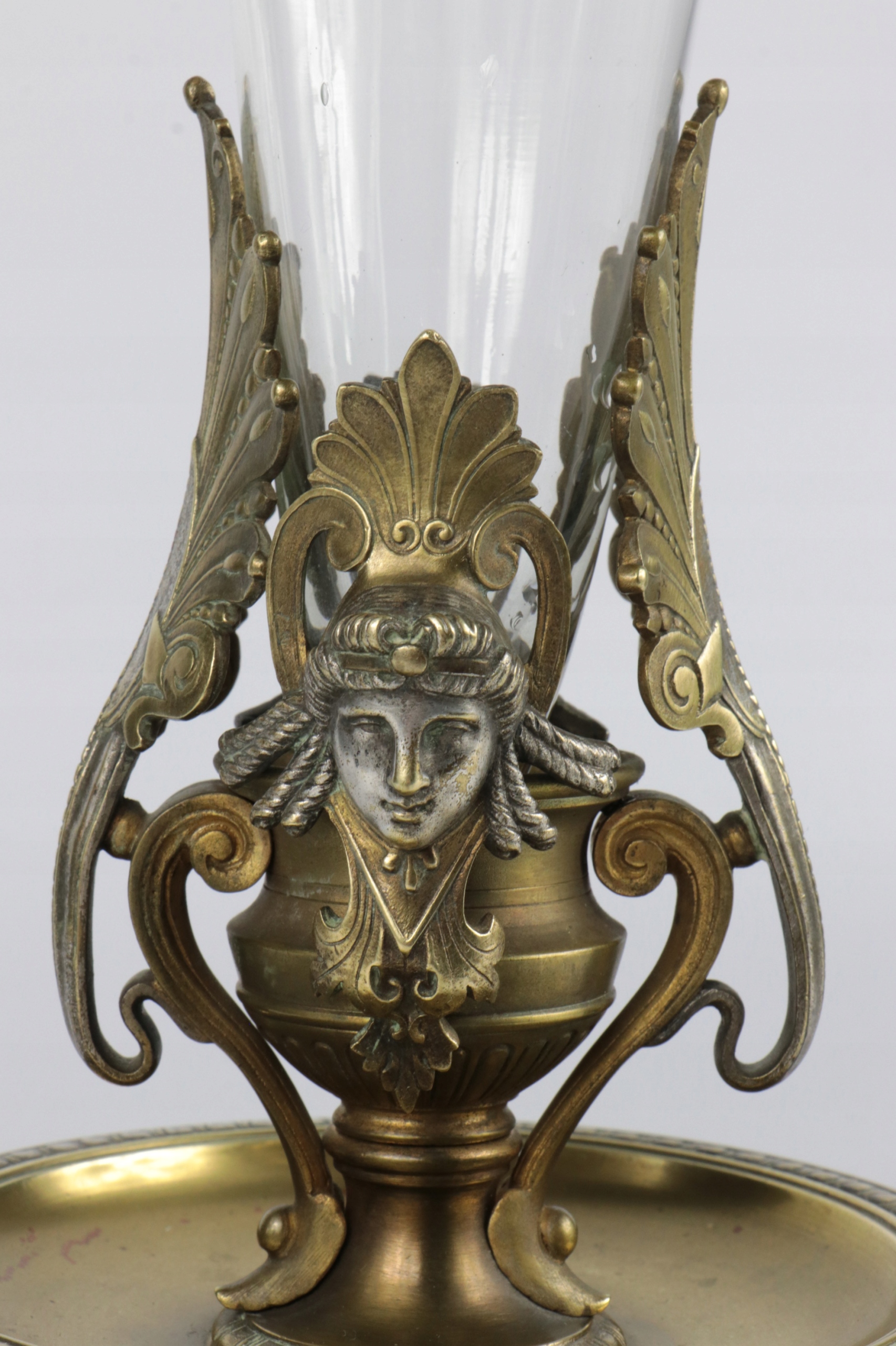 Фигура в центре стола изготовлена из бронзы, частично посеребренной бронзы. Основная часть тарелки вылеплена в виде античных голов и крупных листьев аканта. Бронза, очень качественное литье, без подписи, но должно быть из очень хорошего литейного завода. Отборное неоригинальное стекло опирается по бокам листьями аканта и в нижней части небольшим круглым ободком внутри тарелки. Тарелка, по моему мнению, периода Наполеона III, второй половины 19 века.