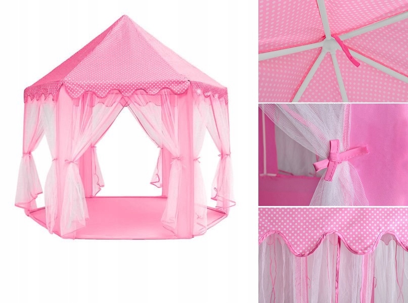 Палатка привлекает его глаза своим очаровательным внешним видом - шестью подготовленную основу, до шести входов и коническая крыша дает ему уникальный характер. Светло -розовый цвет с белым горохом добавляет легкость и девичье очарование, что делает его идеальным выбором для каждой маленькой принцессы.